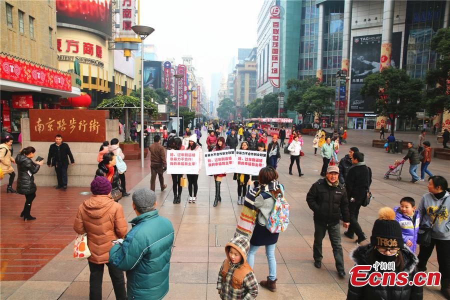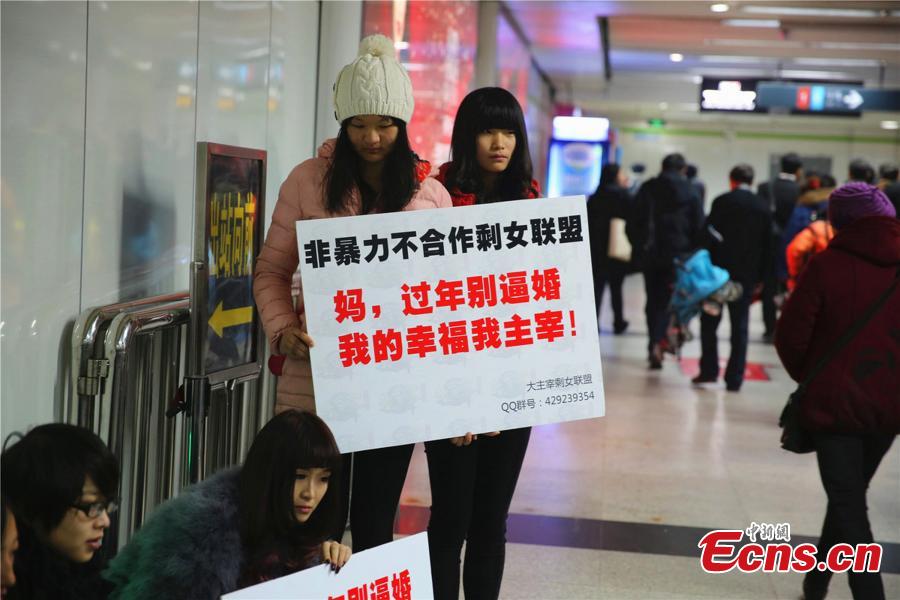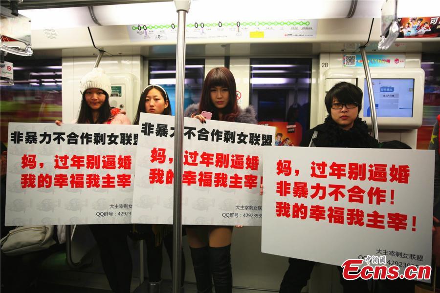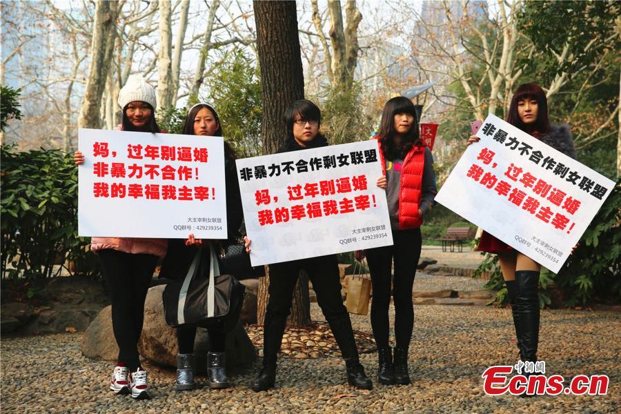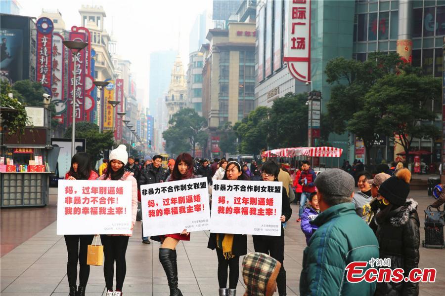 Women carry signs during a protest against marriage pressure in Shanghai, Feb 4, 2015. The sign reads “Mom, do not force me into marriage when I go back home for the New Year. I am responsible for my own happiness.” The holiday of Spring Festival, China’s Lunar New Year, is also a time when many parents will arrange blind dates or force their sons or daughters to get married. [Photo: China News Service/Zhang Yu]