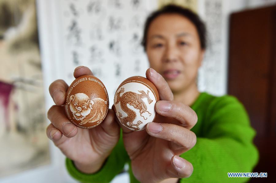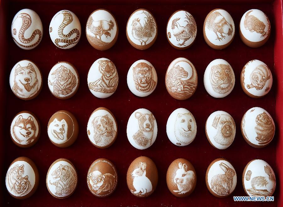 Photo taken on Feb. 4, 2015 shows the egg handicrafts made by Ming Xia, a citizen of Shizuishan City, in a cultural center in Shizuishan City, northwest China's Ningxia Hui Autonomous Region. Having learnt the carving craft on eggs for more than ten years, Ming has created many egg handicrafts, which usually require three days of fine craft on the eggshells of about 0.3 millimeters of thickness. (Xinhua/Wang Peng)