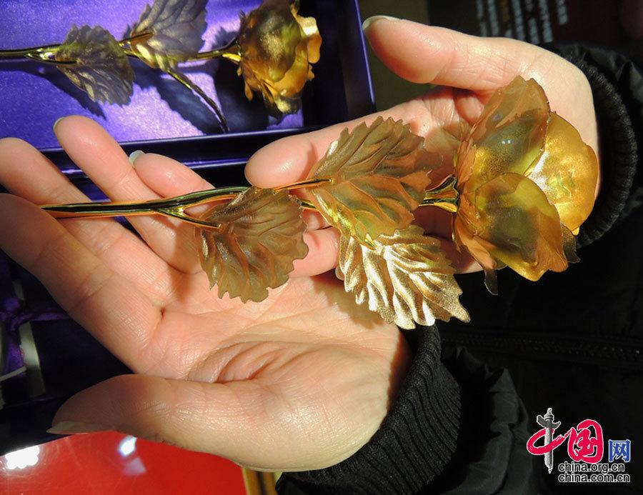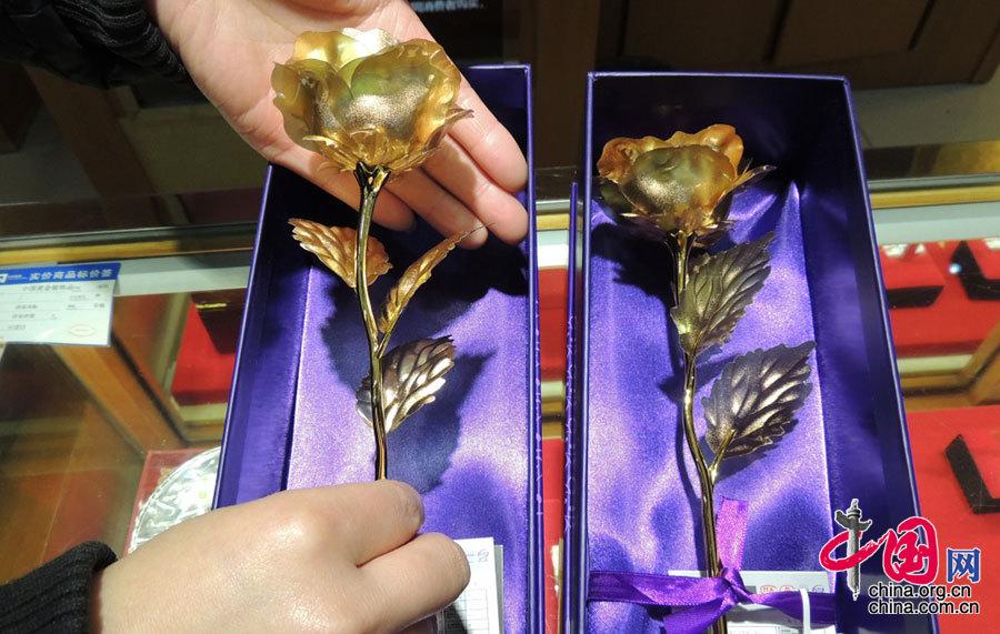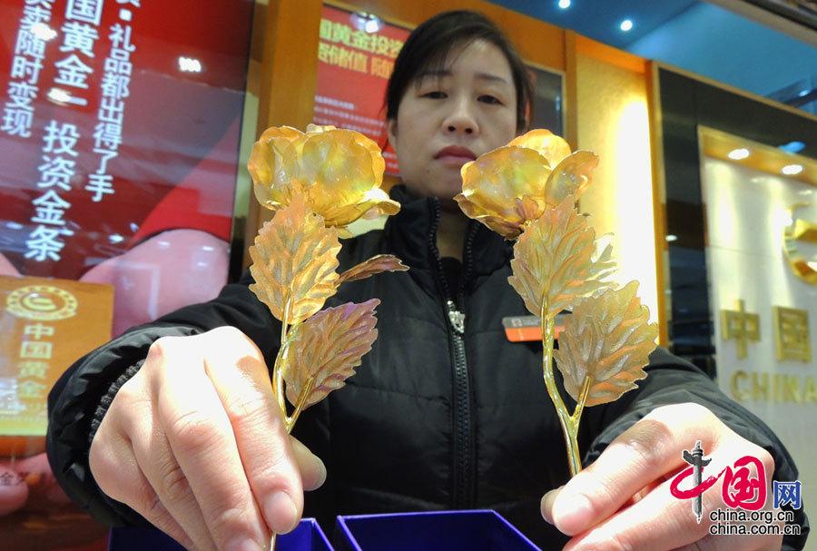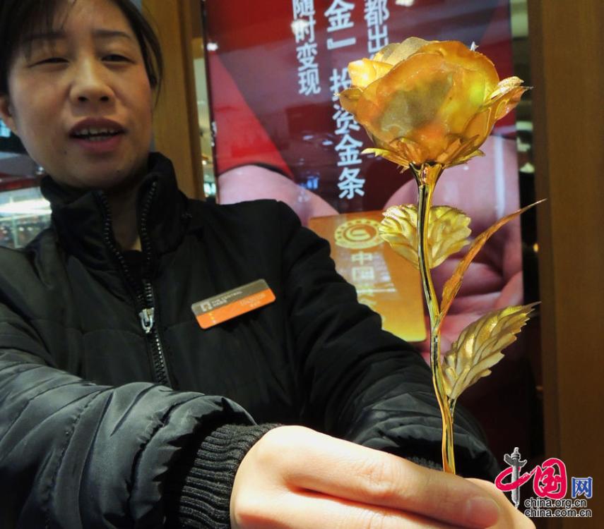 A salesperson shows golden roses in a shopping mall in Haizhou District of Lianyungang City, Jiangsu province, Feb 5, 2015. The never-faded roses add aroma of romance to the upcoming Valentine's Day. [Photo/China.org.cn]