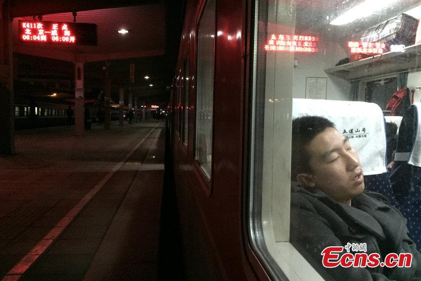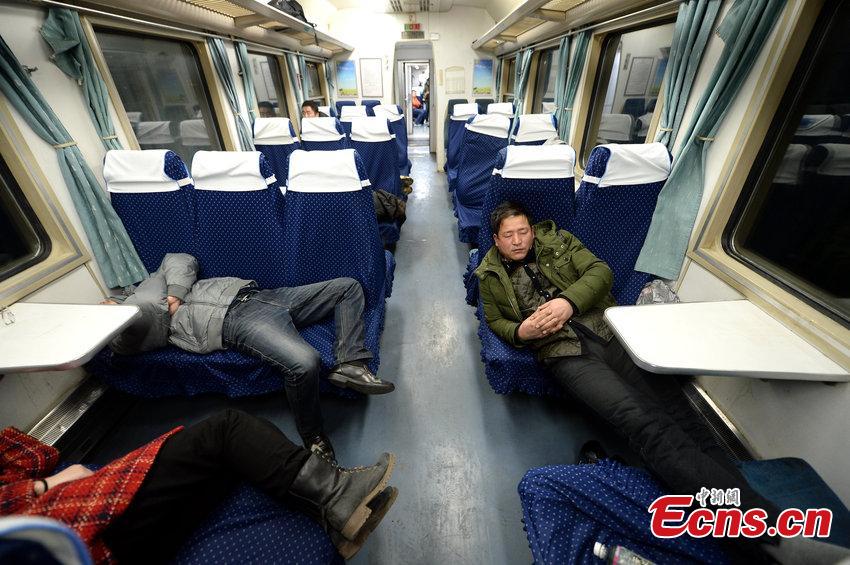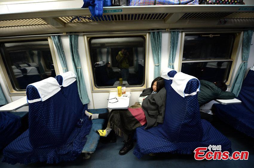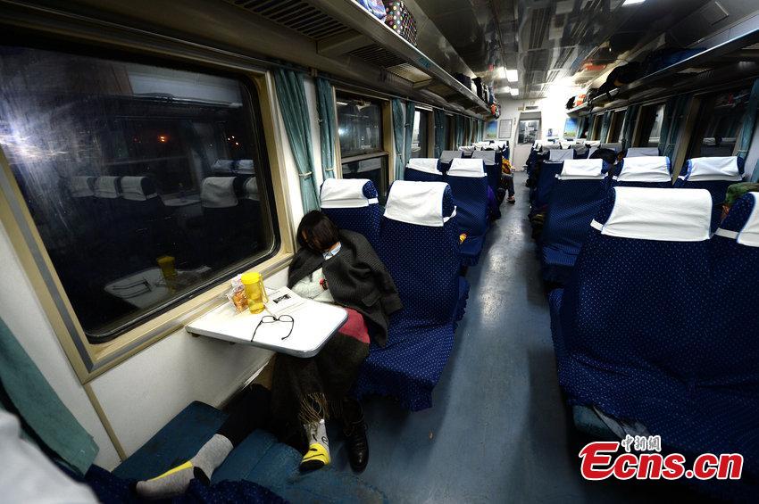 Most of the hard seats are vacant on train K411 which runs from Beijing to Weihai, Shandong province, Feb 5, 2015. Since several high-speed trains were launched between Shandong and Beijing in December, other trains have seen a sharp decline of passengers. [Photo/CFP]