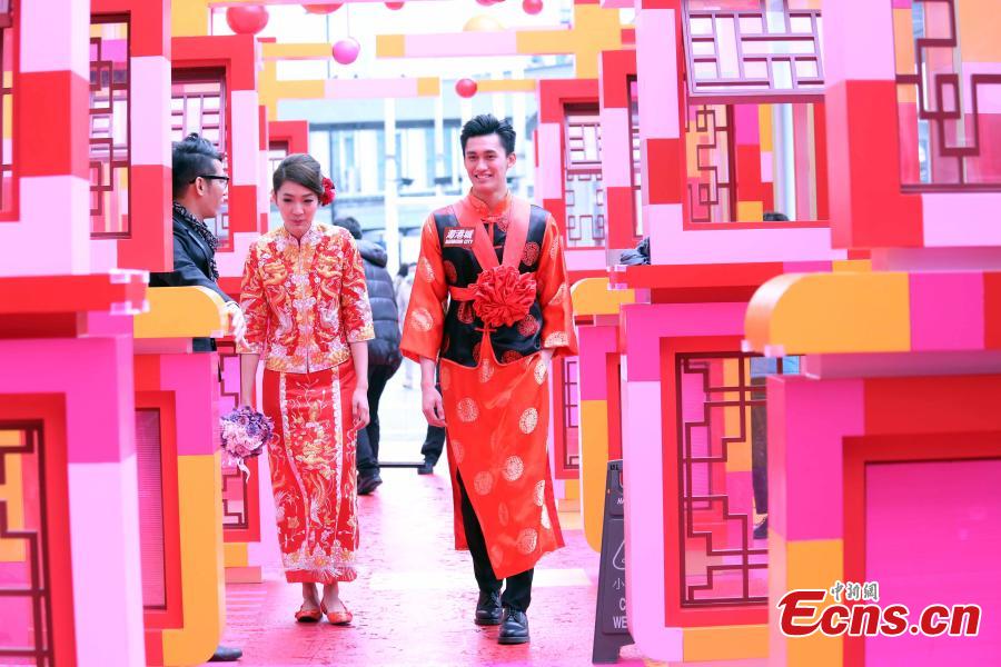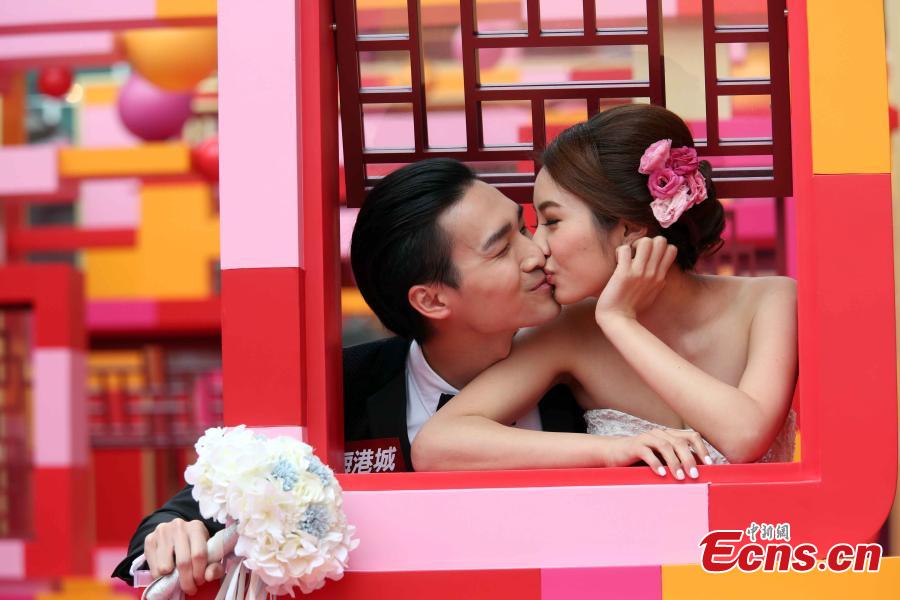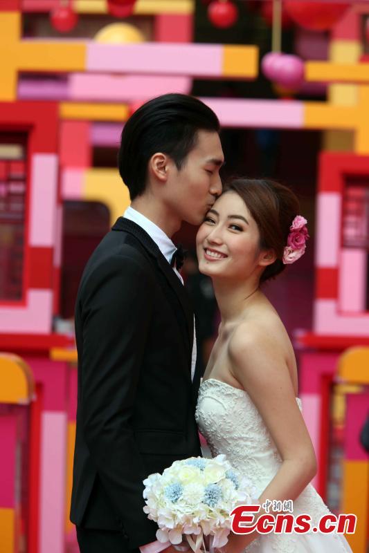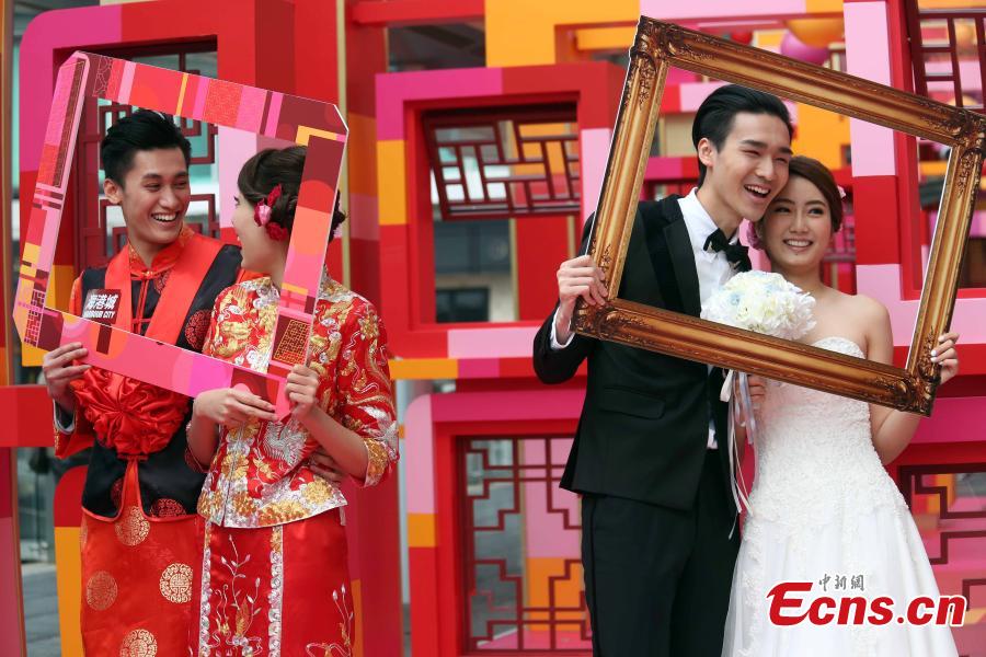 Young couples, wearing traditional Chinese and Western wedding costume separately, pose for wedding photography in the shopping mall Harbour City in Hong Kong, Feb 5, 2015. The shopping mall has renovated the decorations, such as putting traditional screens, to celebrate the Year of the Goat. [Photo: China News Service/Hong Shaokui]