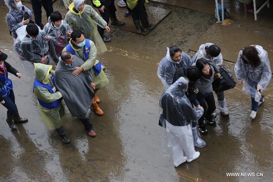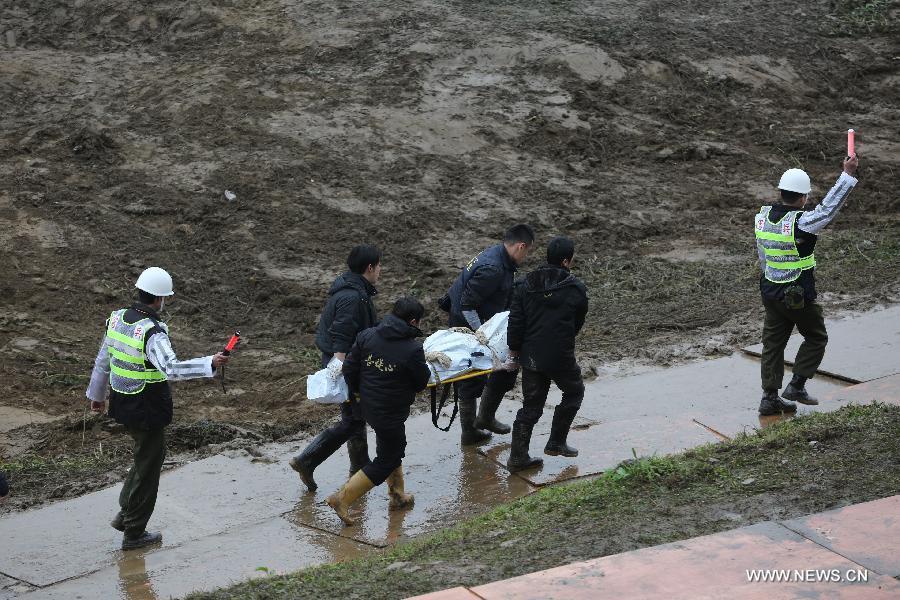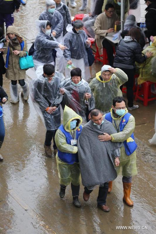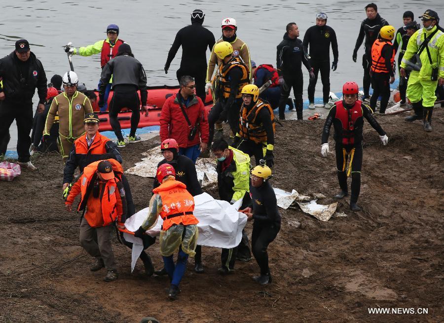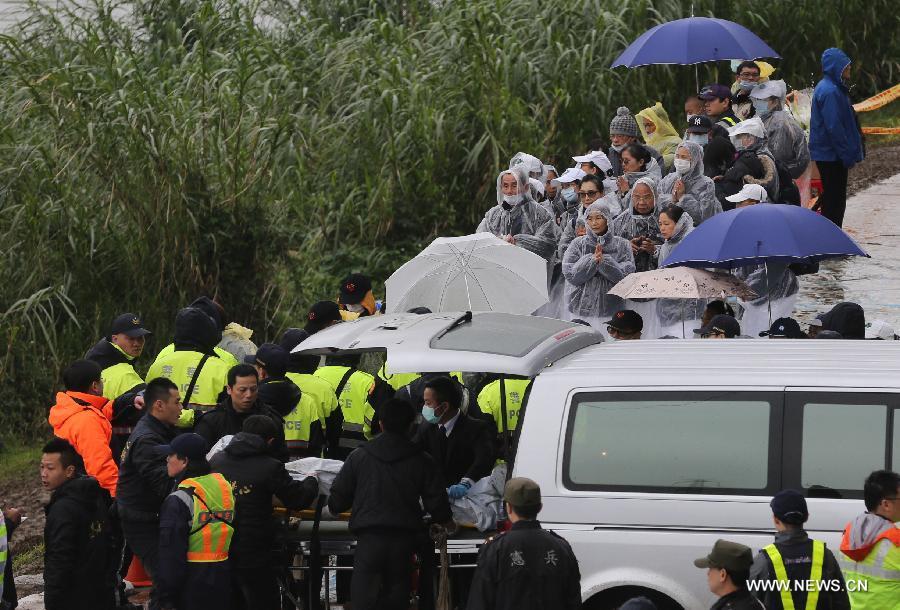 Rescuers put the body of a plane crash victim into a truck on the bank of the Keelung River in Taipei, southeast China's Taiwan, Feb. 6, 2015. Rescuers expanded the search area for the missing passengers Friday and four more bodies were recovered. (Xinhua/Jin Liwang)