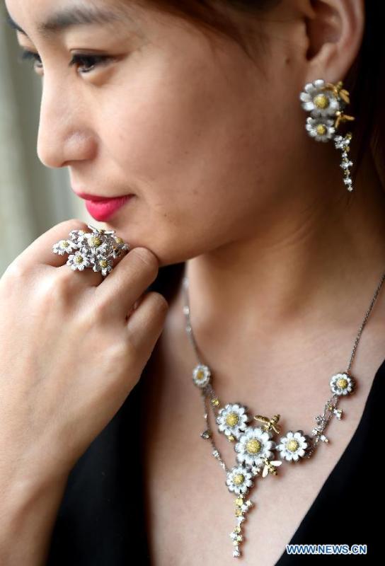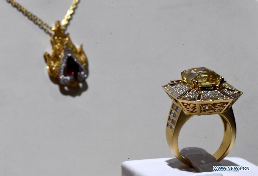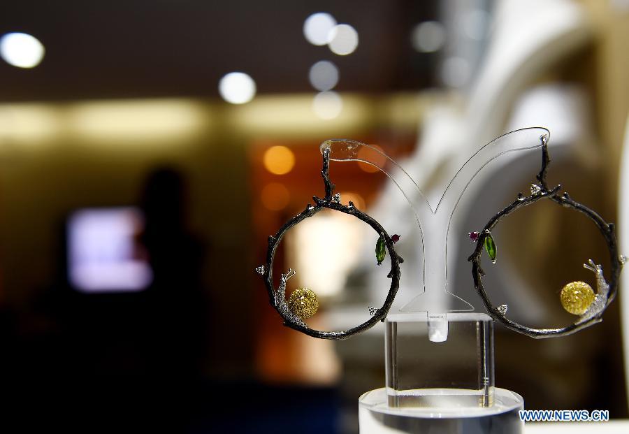 Photo taken on Feb. 6, 2015 shows jewellery displayed during a free jewellery exhibition that combines the Chinese and western cultures in Beijing, capital of China. Displaying jewellery that are made with western craftwork and embody traditional Chinese style, the exhibition will last until Feb. 12. (Xinhua/Jin Liangkuai)