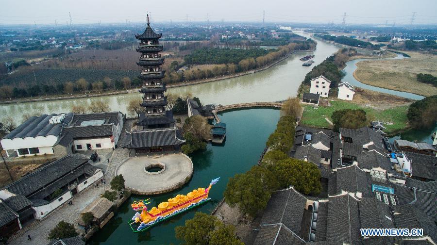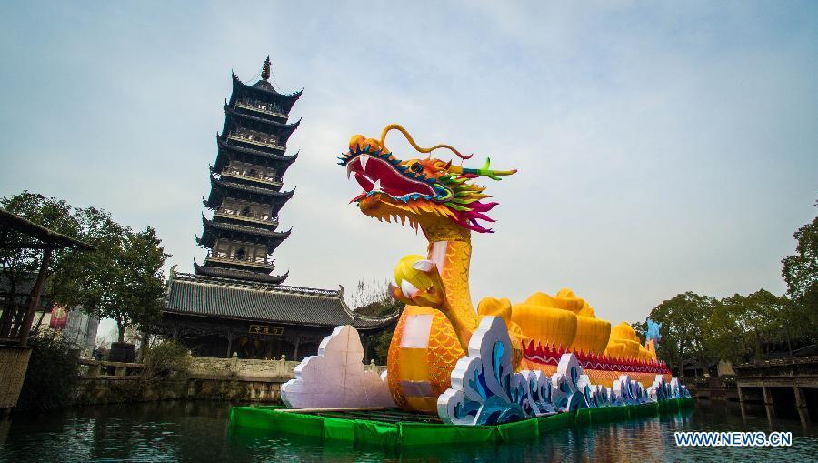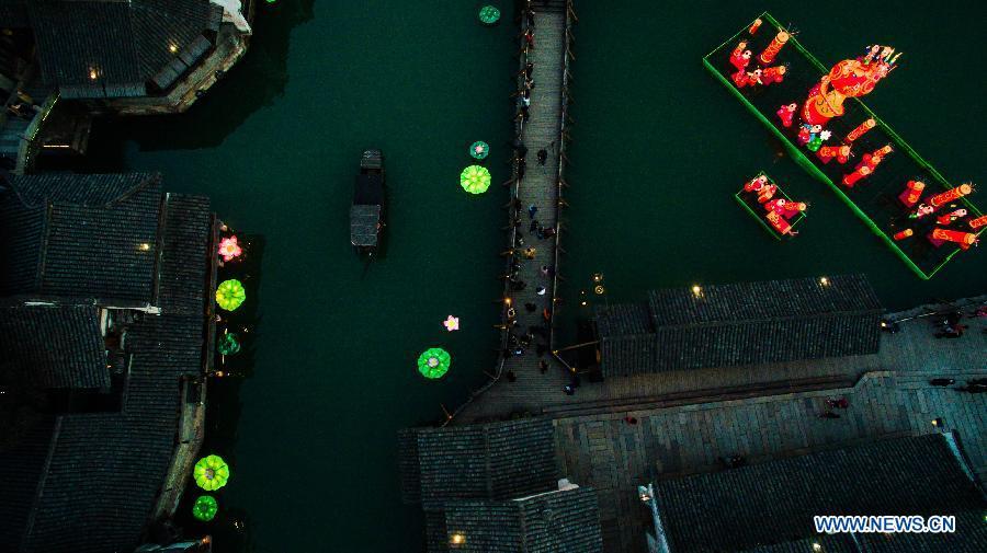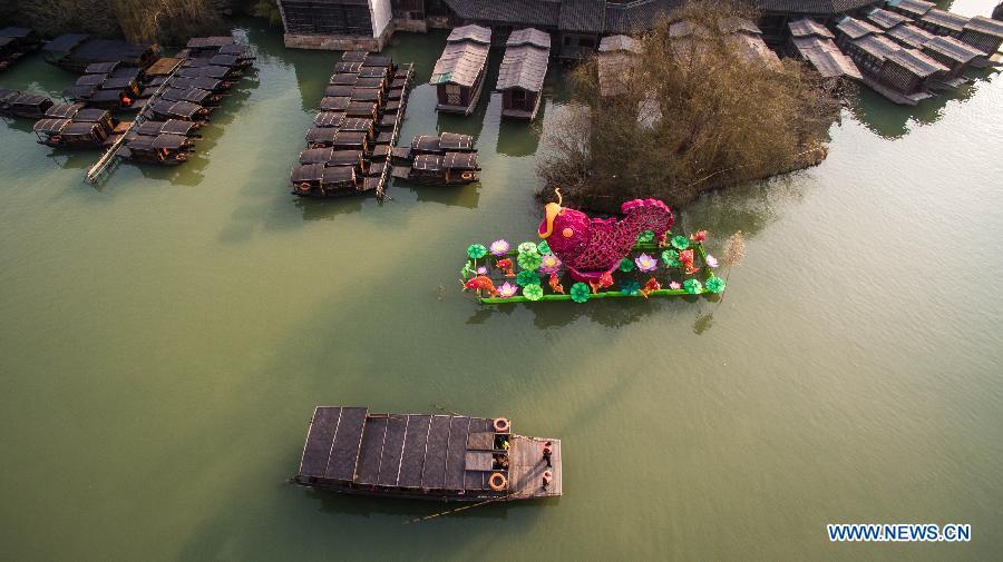 Photo taken on Feb. 6, 2015 shows a group of festival lanterns in Wuzhen, east China's Zhejiang Province. About twenty groups of festival lanterns were set in the town to celebrate the coming Chinese New Year, or Spring Festival, which falls this year on Feb. 19. (Xinhua/Xu Yu)