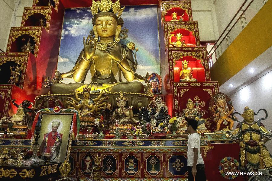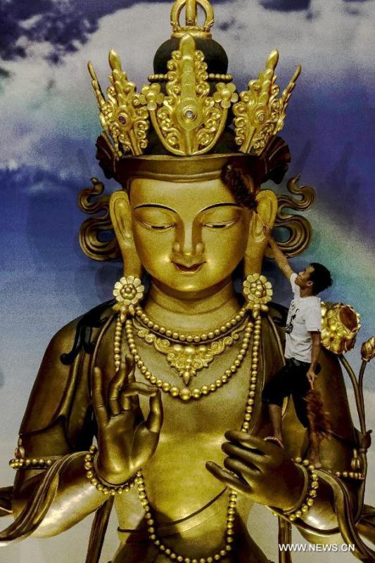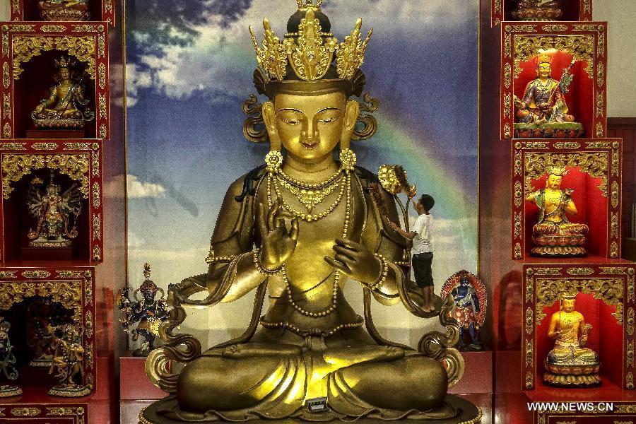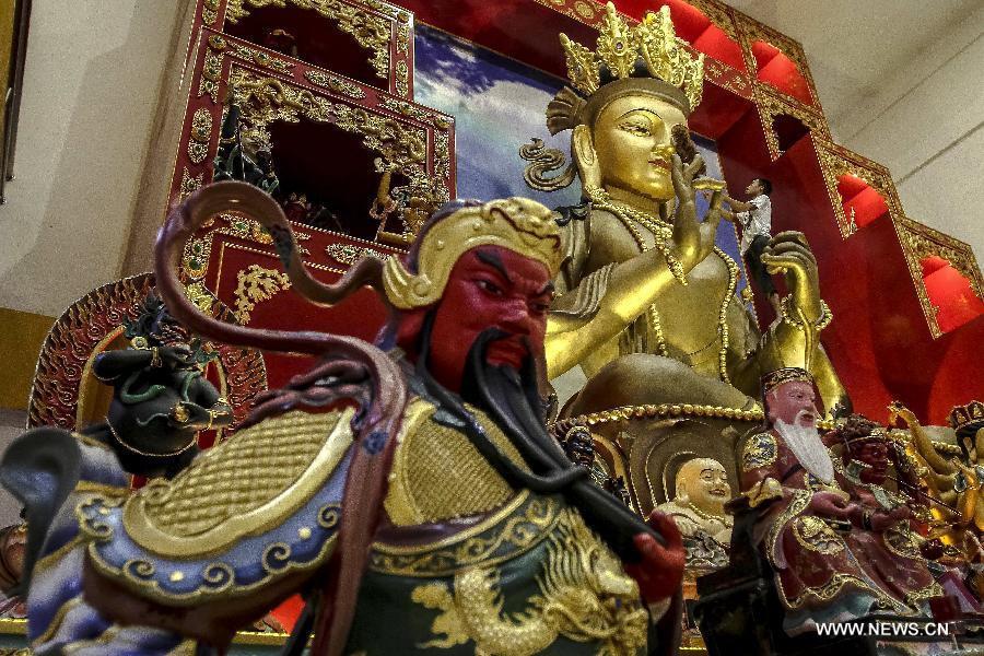 A worker cleans the statue of Buddha to prepare for the celebration of the Chinese lunar New Year in Medan, Indonesia, Feb. 9, 2015. The Chinese lunar New Year will start from Feb. 19 this year. (Xinhua/Tanto H.)