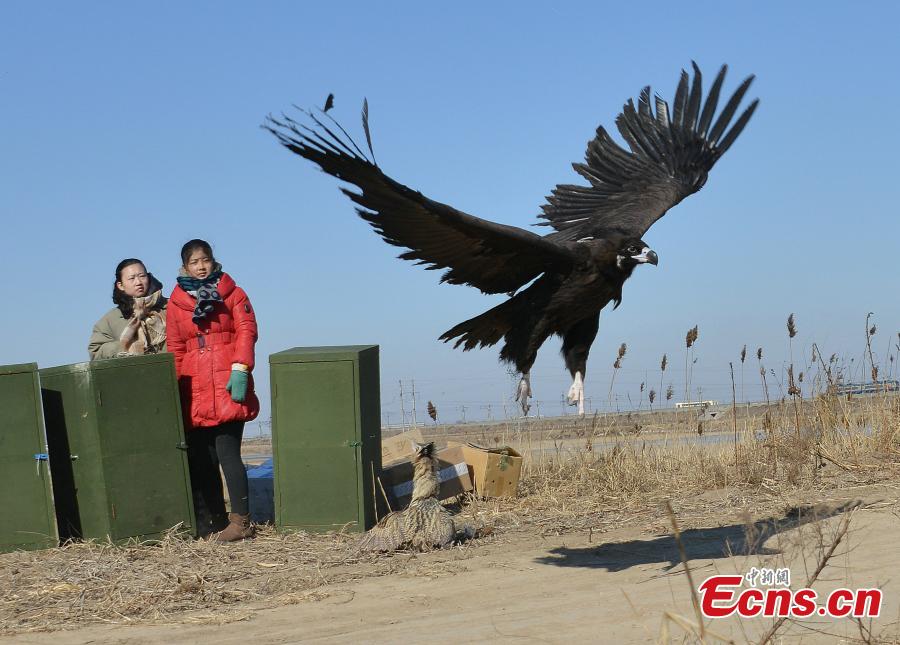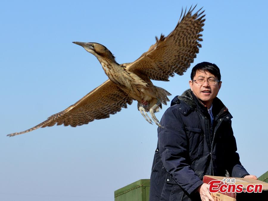 A bird that has recovered from injury during migration is released in Cangzhou, North China’s Hebei province, Feb 8, 2015. Ten birds, including those under the national list of protected animals, were treated by volunteers of Wildlife Rescue and Rehabilitation Centre in Cangzhou and returned to the nature. [Photo: China News Service/Wang Shaohua]