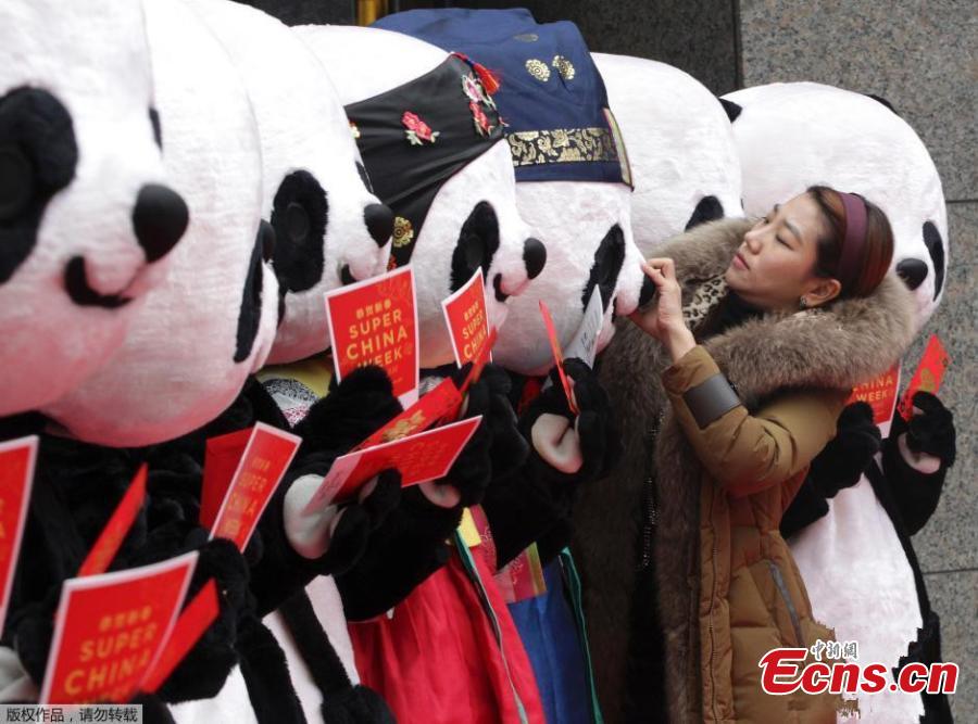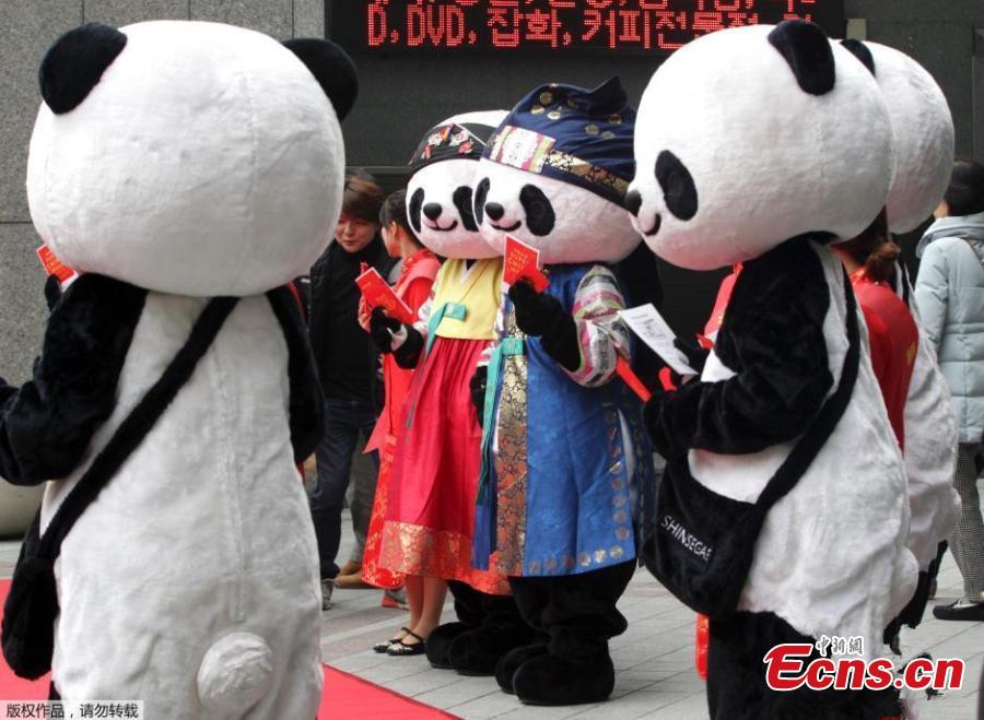 Wearing panda costumes, members of an opera troupe stand outside a shopping mall to greet customers in Seoul, South Korea, Feb 10, 2015. Those panda greeters are invited by the mall to attract Chinese customers during the Spring Festival shopping spree. [Photo/ China News Service]
