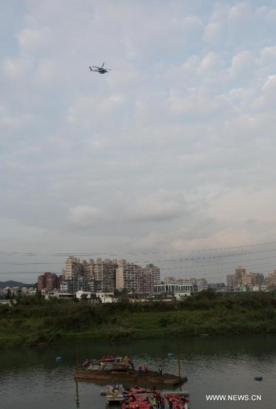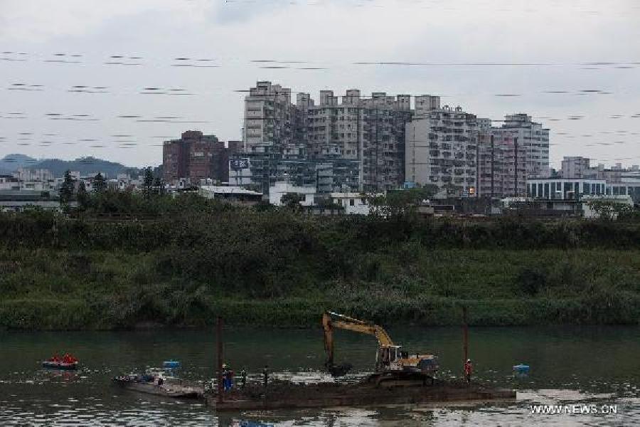 Rescuers dredge up mud from bed of the Keelung River while seaching for the last passenger missing in the TransAsia Airways plane crash, in Taipei, southeast China's Taiwan, Feb. 11, 2015. Another two bodies were found from the Keelung River on Wednesday. As of 4:00 p.m. on Wednesday, among the 58 passengers and crew members of the flight, 42 people were dead, 15 injured and one missing. (Xinhua/Jin Linwang)