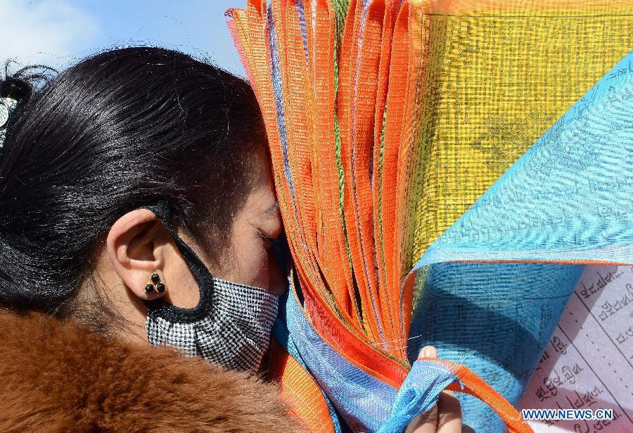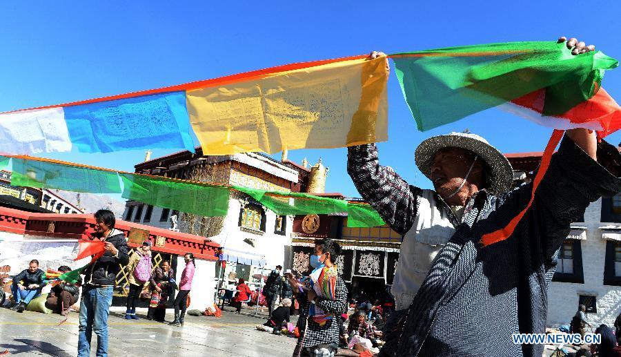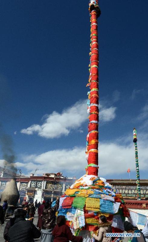 A devotee hangs prayer flags to a pole near the Jokhang Temple in Lhasa, capital of southwest China's Tibet Autonomous Region, Feb. 11, 2015. As the Tibetan New Year draws near, prayer flags tied on the five poles surrounding the Jokhang Temple have been replaced by new ones in accordance with Tibetan tradition. The New Year under the Tibetan calendar coincides with the Spring Festival this year, which falls on Feb. 19. (Xinhua/Chogo)