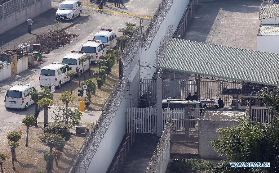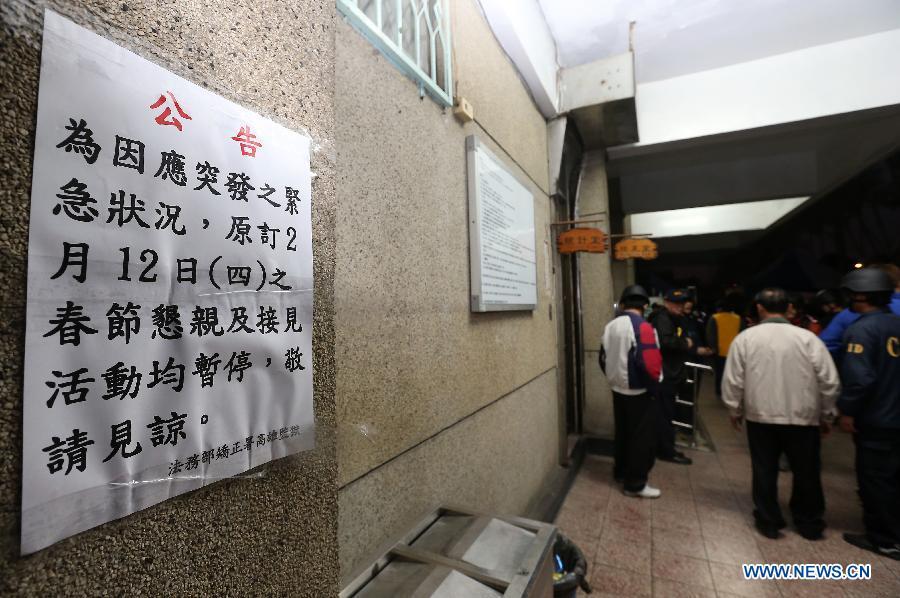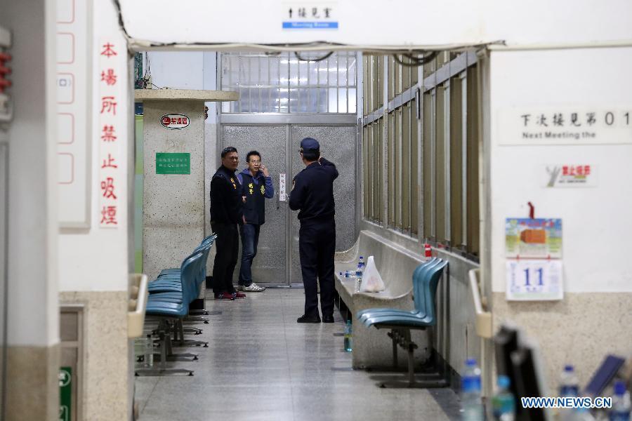 Policemen investigate the suicide site of six convicts at Kaohsiung Prison in Kaohsiung, southeast China's Taiwan, Feb 12, 2015. Six convicts carrying rifles and handguns who took hostages at Kaohsiung Prison killed themselves early Thursday morning, ending nearly 14 hours of standoff with the police. The two hostages, including prison warden Chen Shih-chih and head guard Wang Shih-tsang were both safe, officials said. (Xinhua)