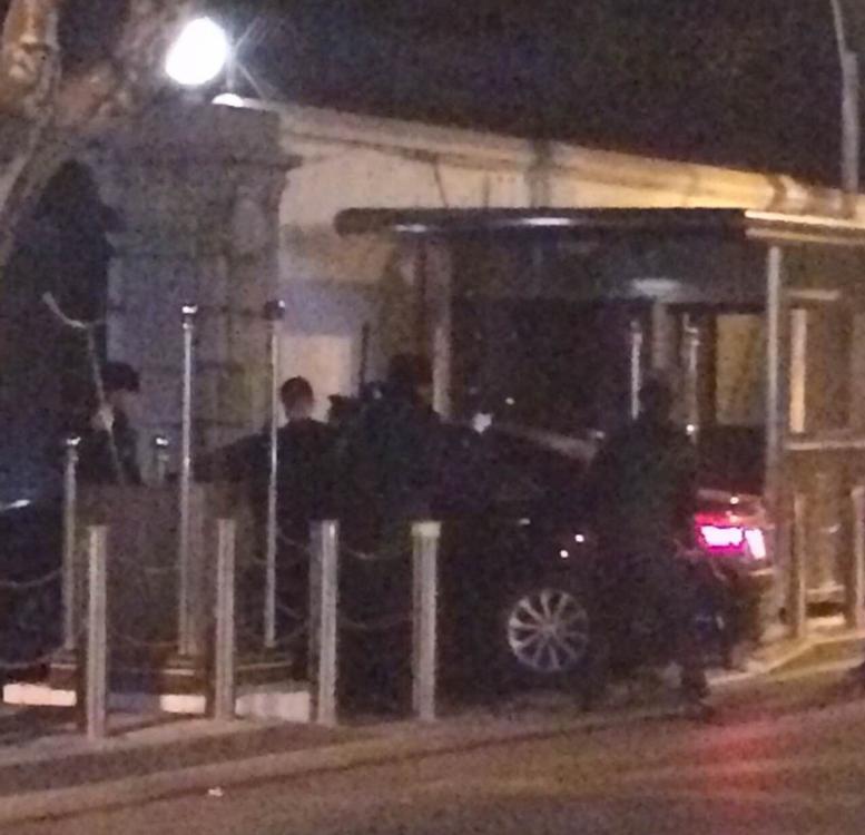Photo shows the black sedan which intended to crash into the Consulate General of the United States in Shanghai late Thursday, injuring a Chinese armed police guard. (Photo/Xinhua)