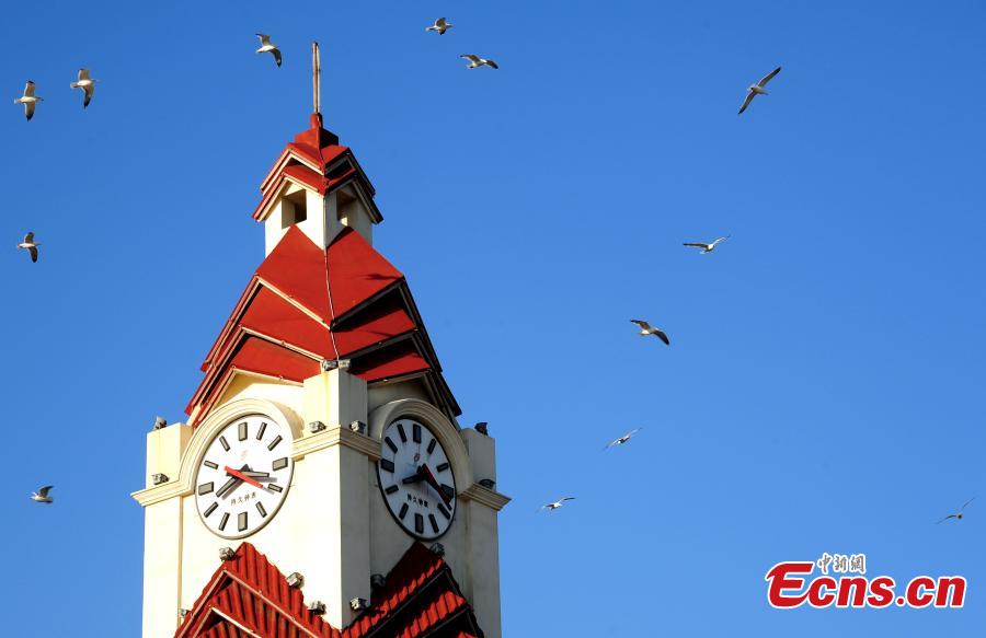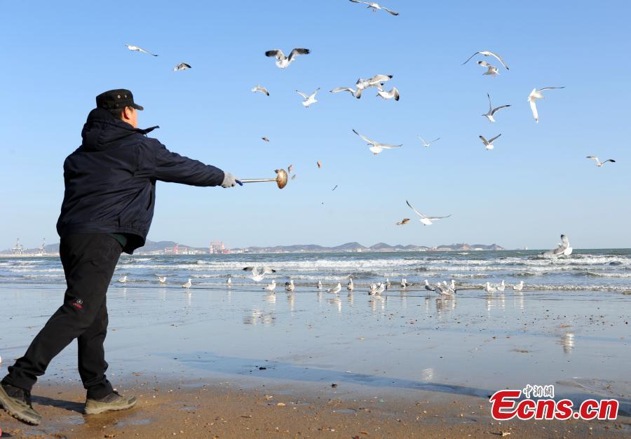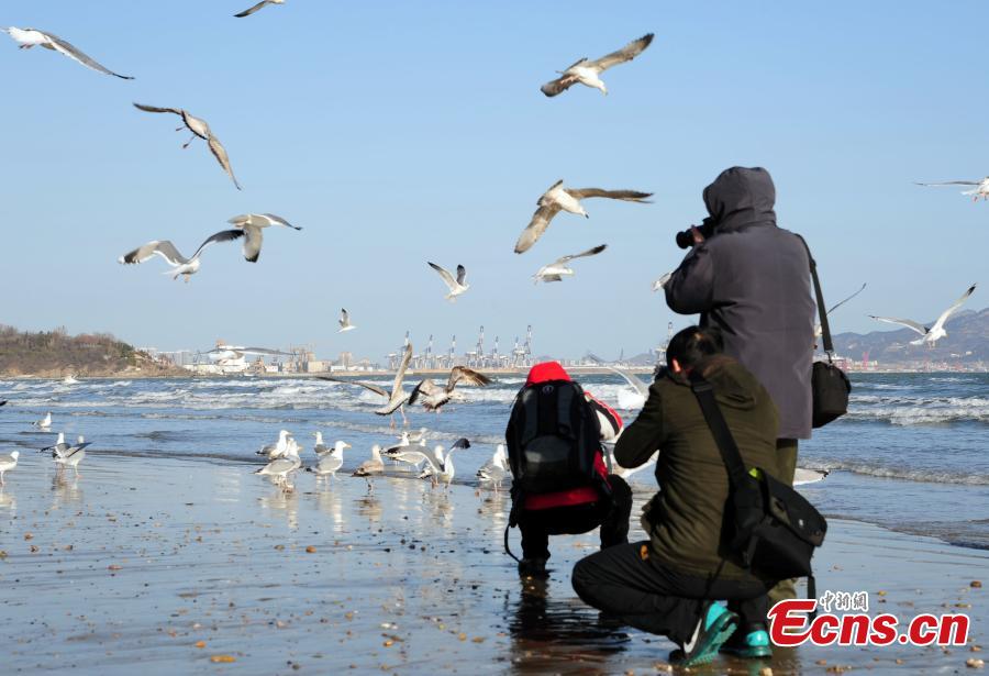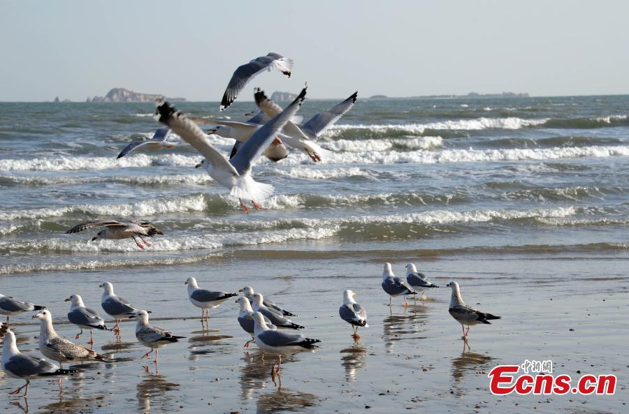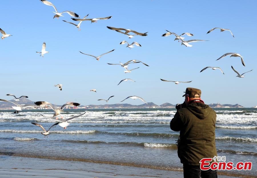 Seagulls fly above the beach in Yantai, East China’s Shandong province, Feb 12, 2015. A local team established years ago has been responsible for feeding seagulls and rescuing the injured, making the seabirds' population grow significantly. [Photo: China News Service/Wang Jiaoni]