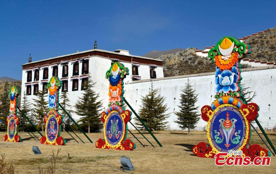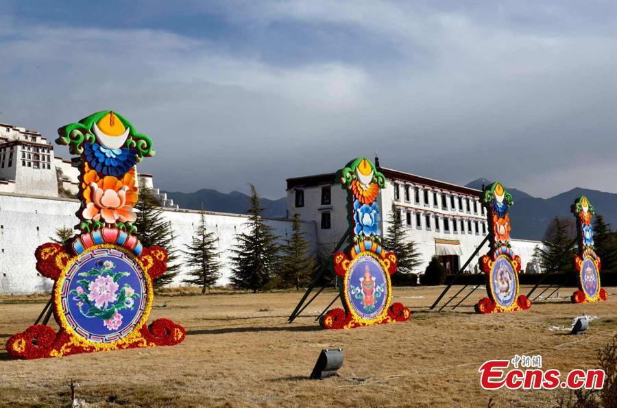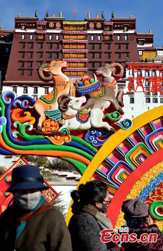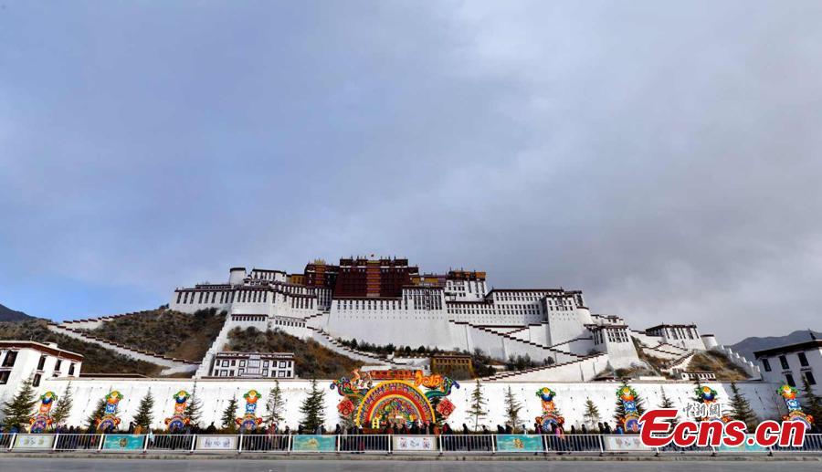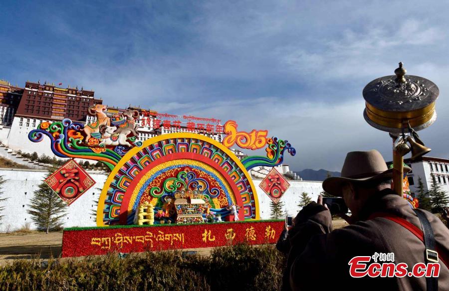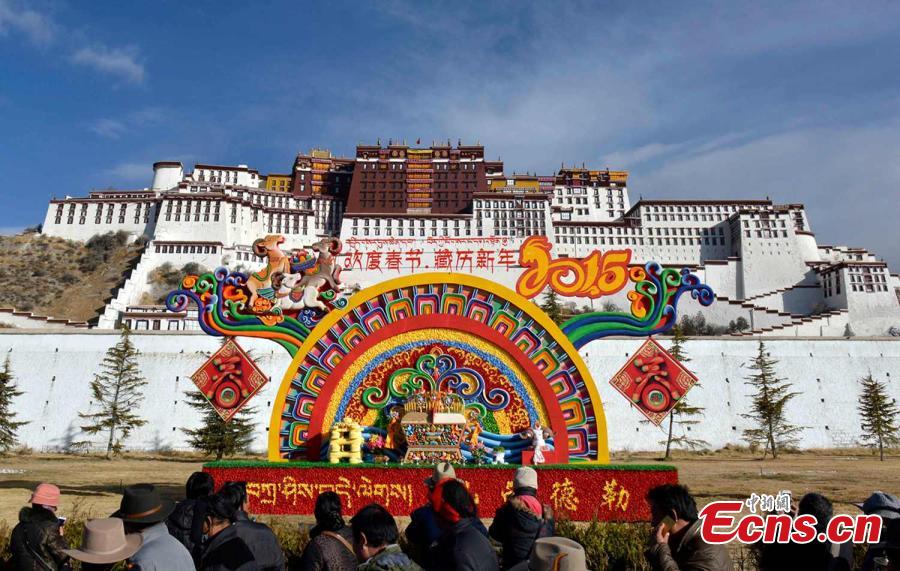 Decorations are made in front of the Potala Palace in Lhasa, Southwest China’s Tibet autonomous region, Feb 12, 2015. Tibetan New Year, also called Losar, falls on Feb 19 and it is the Year of the Wood Goat. [Photo: China News Service/Li Lin]