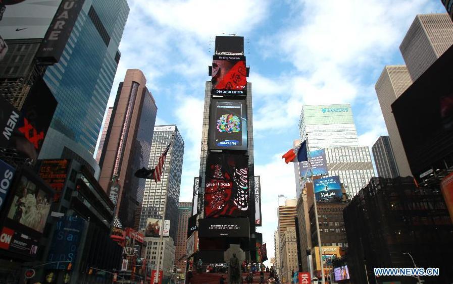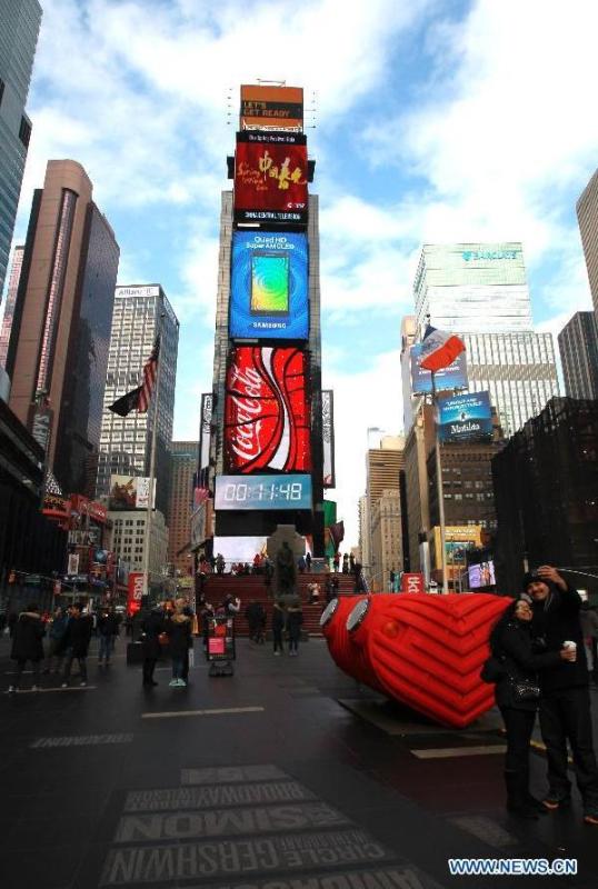 The publicity video of the China's Central Television (CCTV) Spring Festival Gala is shown on the LCD screen leased by Xinhua Gallery Media Co. at Times Square, New York, the United States, on Feb. 12, 2015. (Xinhua/Cheng Li)