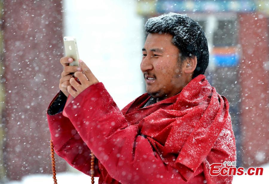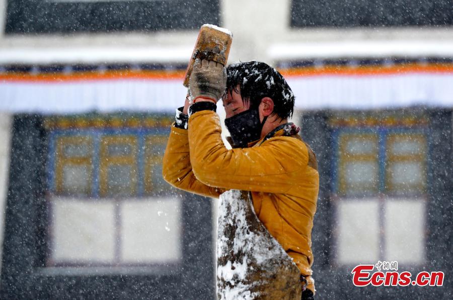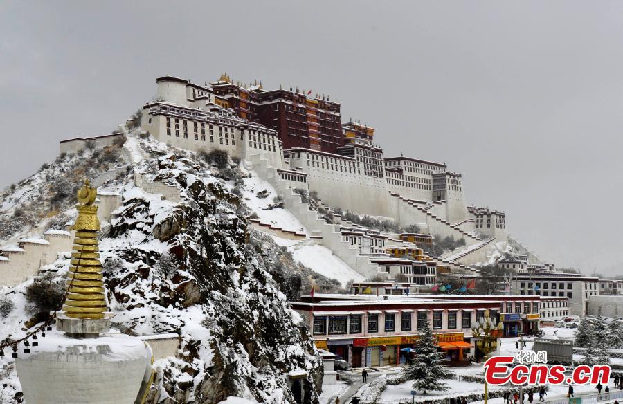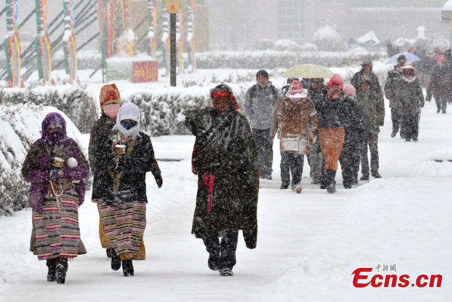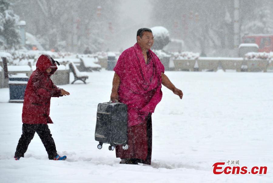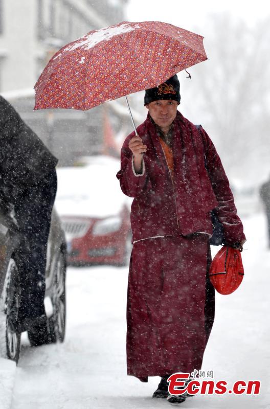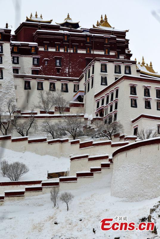 Lhasa, capital of southwest China's Tibet Autonomous Region, had its heaviest snowfall in two decades Friday, seen as a good omen for the upcoming Tibetan year of the "wooden sheep". [Photo/ China News Service]