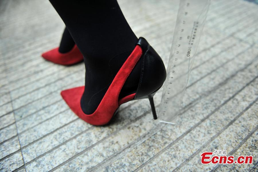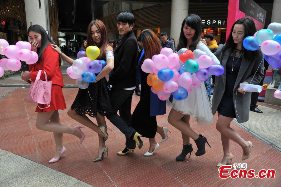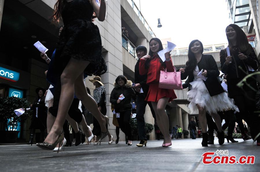 High heel-clad runners race in a shopping mall during an activity to celebrate the Valentine's Day in Kunming, Southwest China’s Yunnan province, Feb 14, 2015. [Photo: China News Service/Ren Dong]
