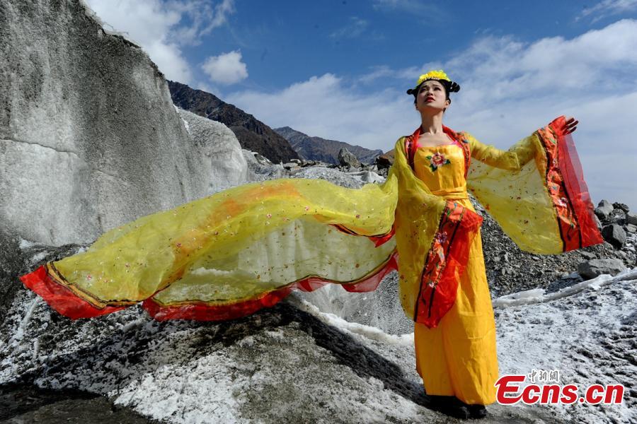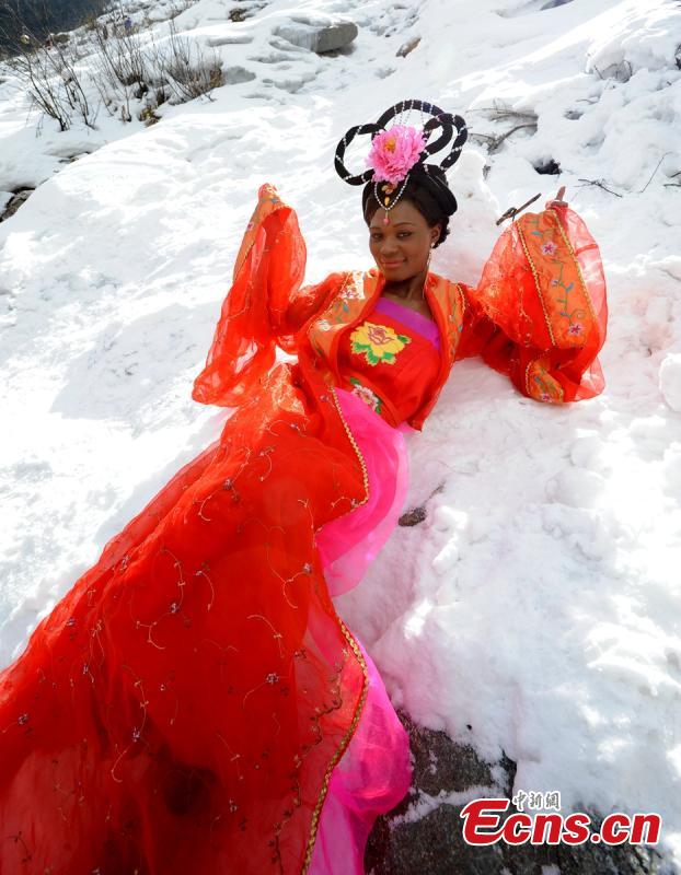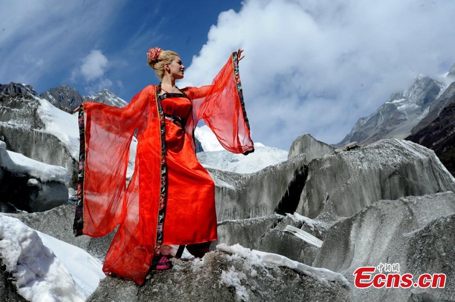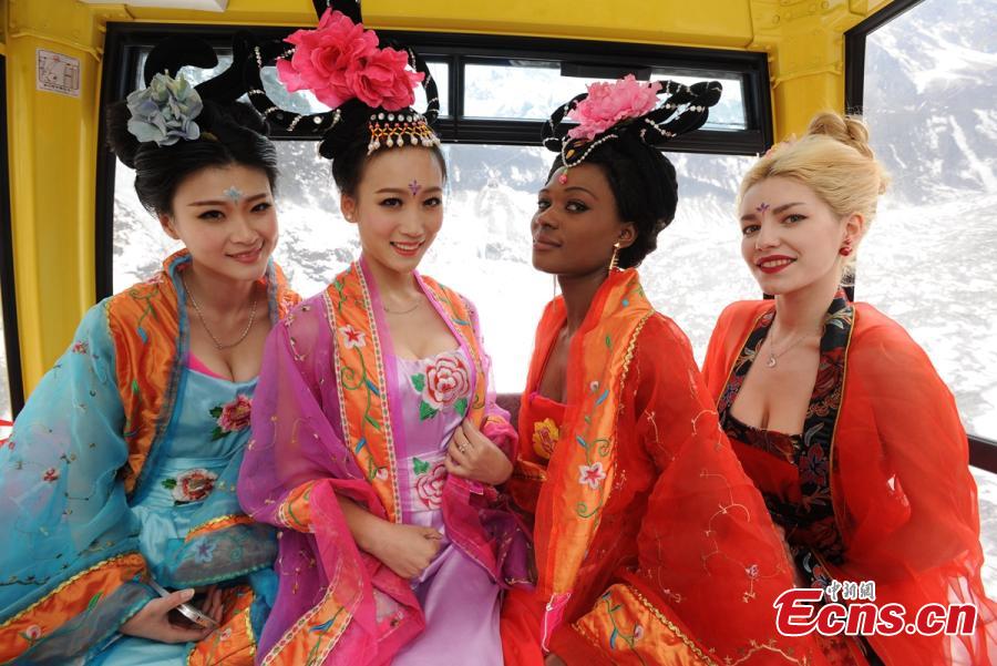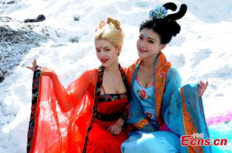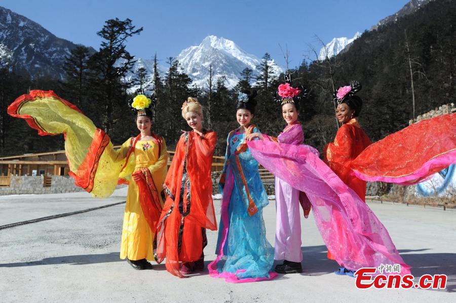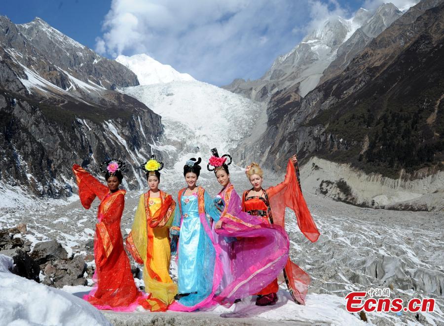 Models in dresses inspired by the popular Chinese TV drama "The Empress of China" pose for a picture at the Hailuogou National Glacier Forest Park in Luding county, Southwest China’s Sichuan province in February, 2015. [Photo: China News Service/Liu Zhongjun].