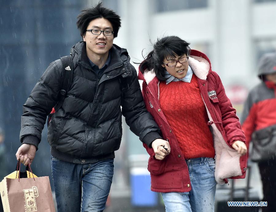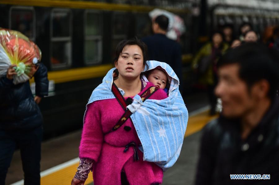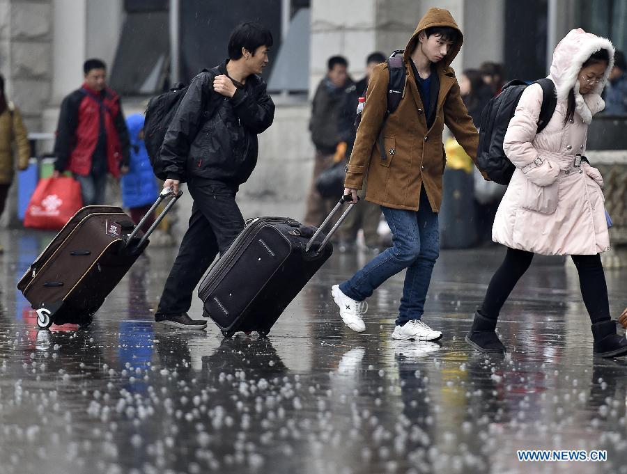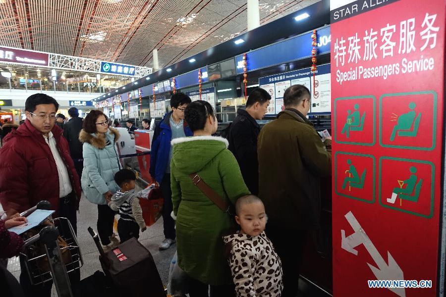 Passengers check in at counters at the Beijing Capital International Airport in Beijing, capital of China, Feb 15, 2015. A travel rush is seen at the airport on Sunday as passengers are hurry for home reunion during the Spring Festival or China Lunar New Year, which falls on Feb 19 this year. (Xinhua/Jin Liangkuai)