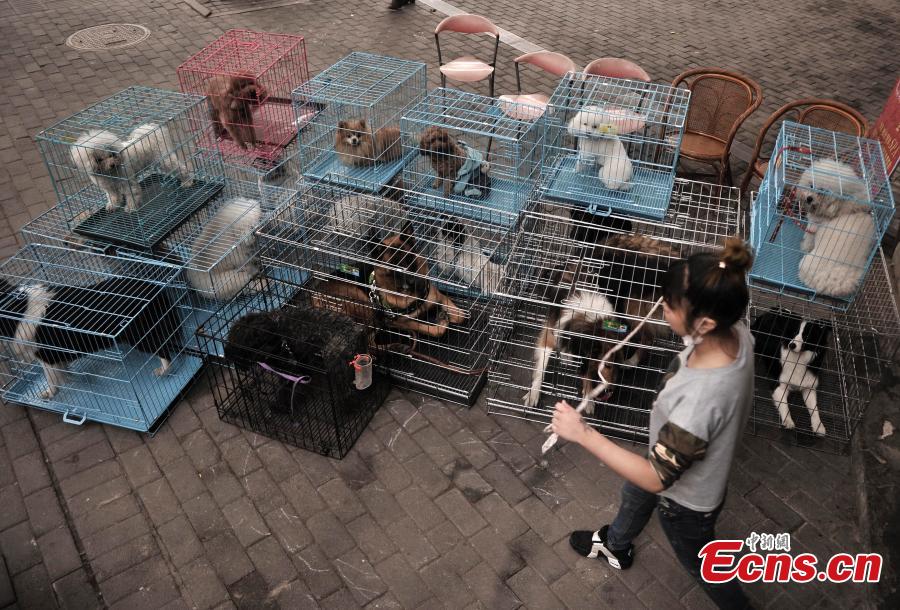 Cages loaded with pets to be groomed are seen outside a pet beauty shop in Nanping district, Southwest China’s Chongqing municipality, Feb 15, 2015. With the upcoming Spring Festival, China’s Lunar New Year, pet owners want to have their pets look great. [Photo: China News Service/ Chen Chao]