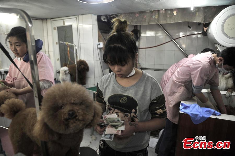 Pet groomers are busy grooming pets in a beauty shop in Nanping district, Southwest China’s Chongqing city, Feb 15, 2015. With the upcoming Spring Festival, China’s Lunar New Year, pet owners want to have their pets look great. [Photo: China News Service/ Chen Chao]