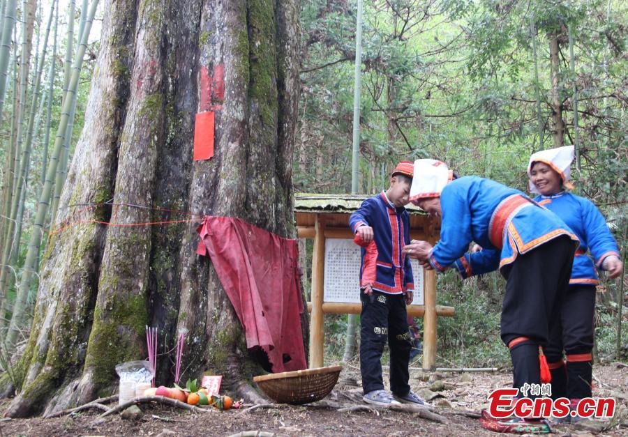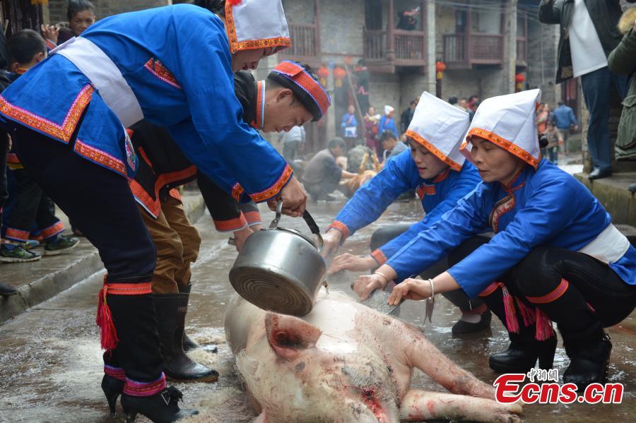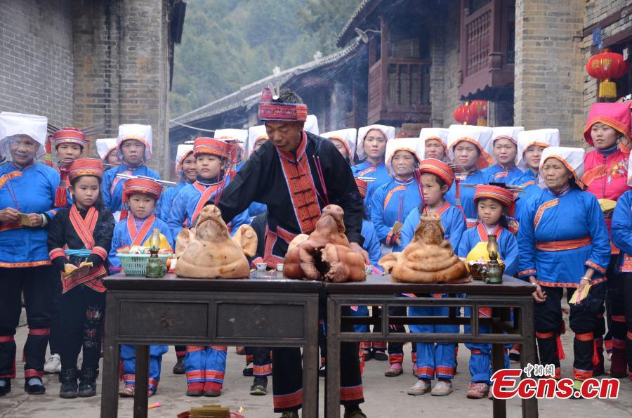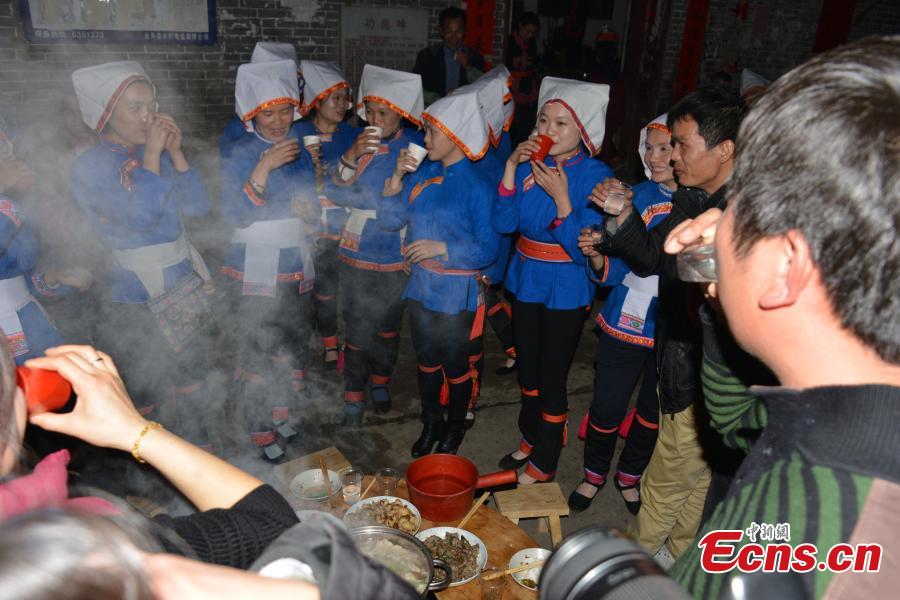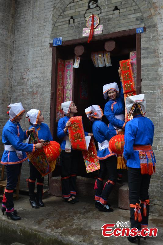 Women of Yao Ethnic group paste Spring Festival couplets during the Agu Festival at the Liuduan village in Jinxiu Yao autonomous county, Southwest China’s Guangxi Zhuang autonomous region, Feb. 15, 2015. Yao people in the village, built during Qing Dynasty (1644-1911), usually observe the festival on the 27th or 28th day of the 12th lunar month, also the start of celebrations of Lunar New Year. (Photo: China News Service/ Luo Shan)