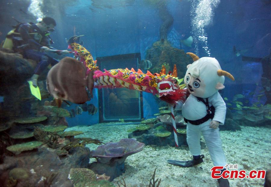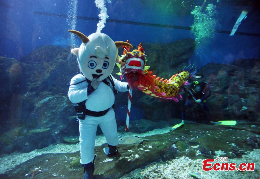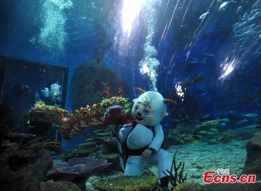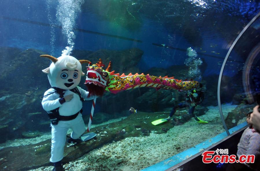 A worker dressed as a character of popular Chinese cartoon series "Happy Sheep and Grey Wolf" performs dragon dance at the Haichang Polar Ocean World in Chengdu, Southwest China’s Sichuan province, Feb. 16, 2015 to celebrate the Spring Festival, China’s Lunar New Year that falls on Feb. 19 this year. 2015 is the Year of the Sheep in China’s lunar calendar. (Photo: China News Service/Zhong Xin)