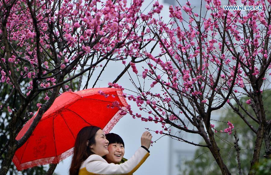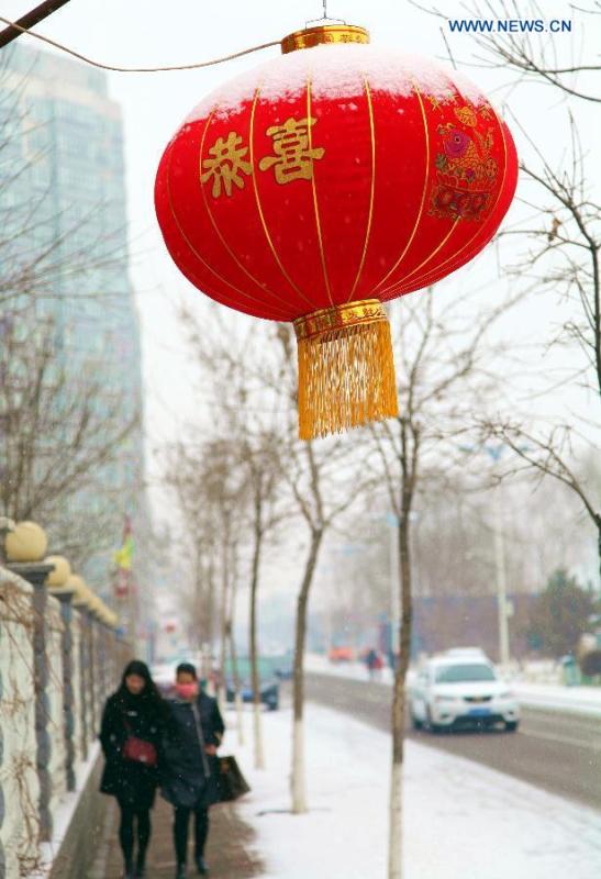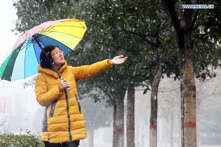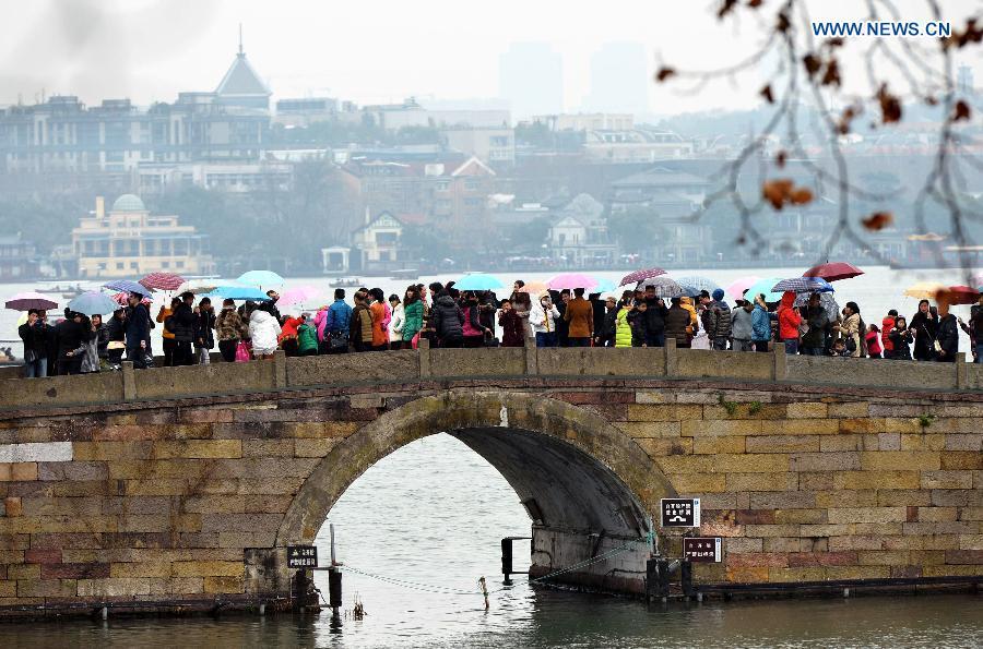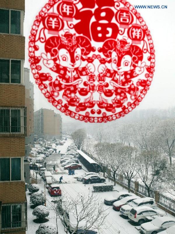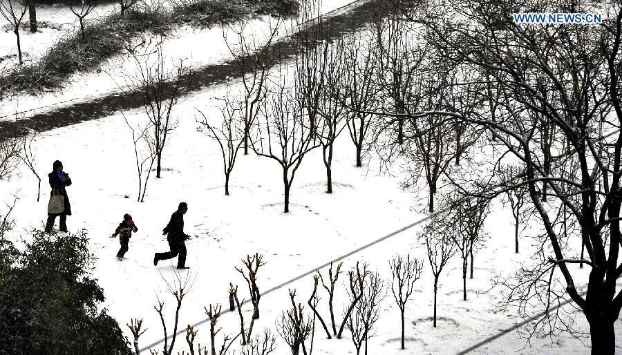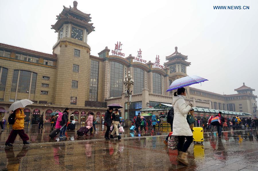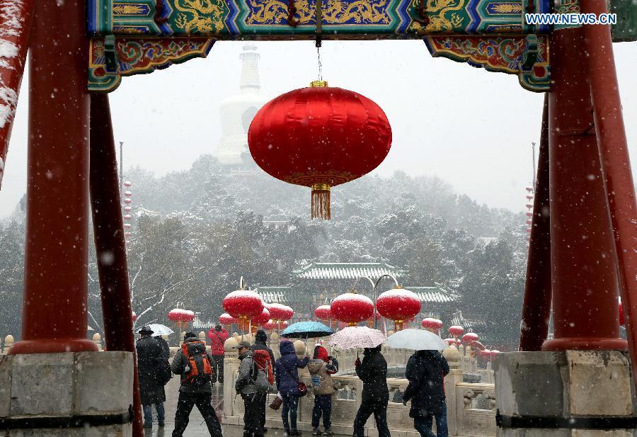 People visit Beihai Park in snow in Beijing, capital of China, Feb. 20, 2015. Rain andsnow has hit east and central China since Thursday, the second day of the Lunar New Year holiday. (Xinhua/Wang Xibao)