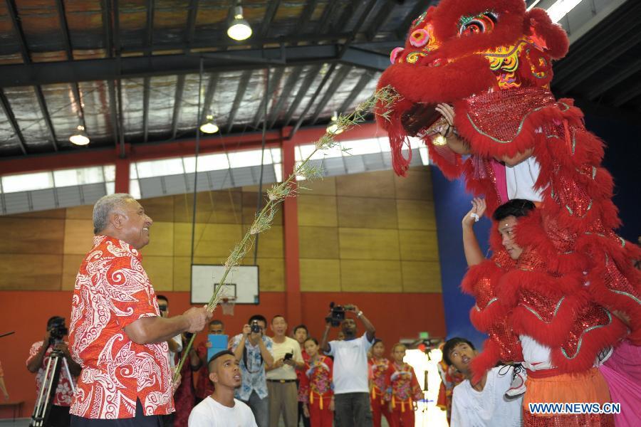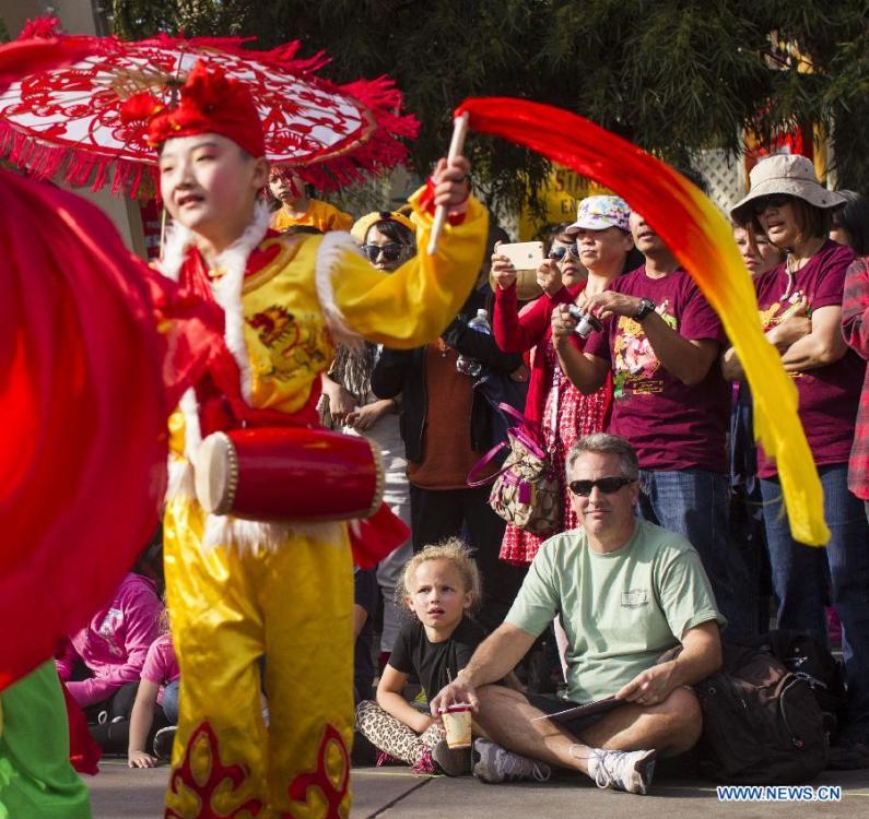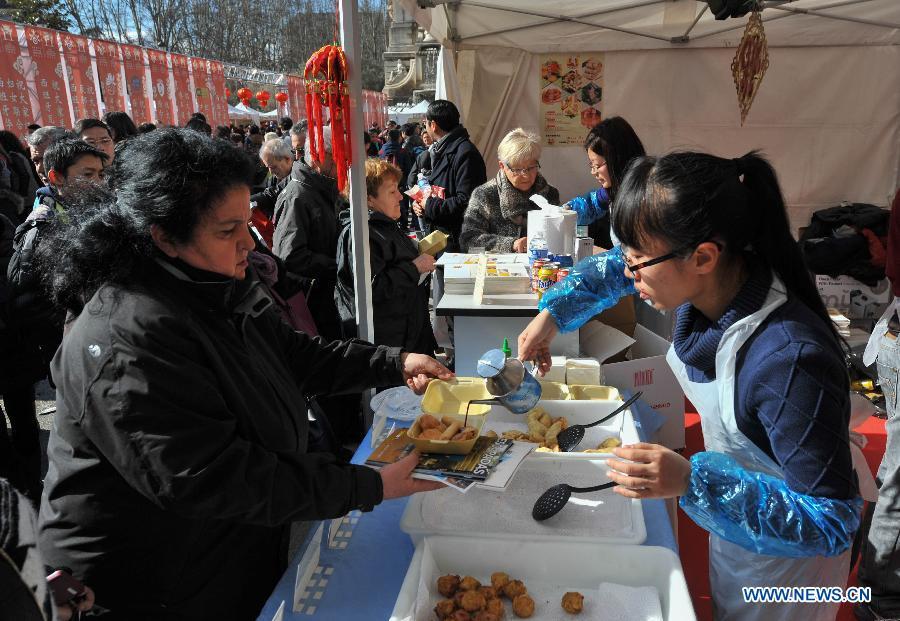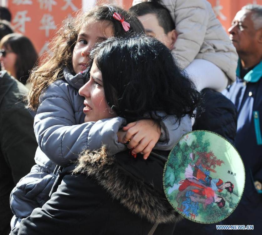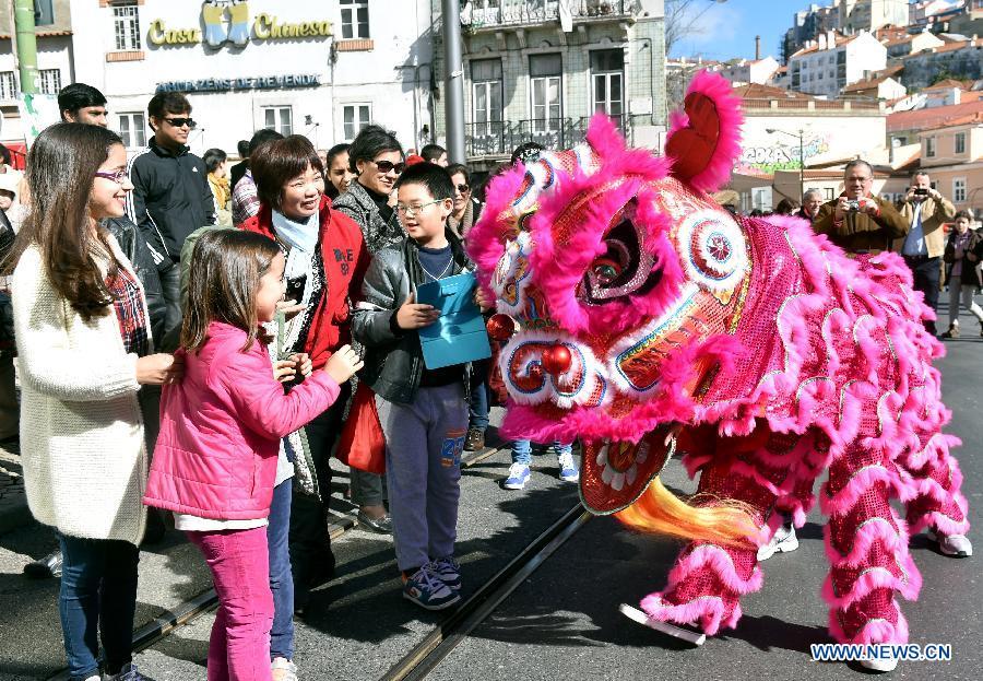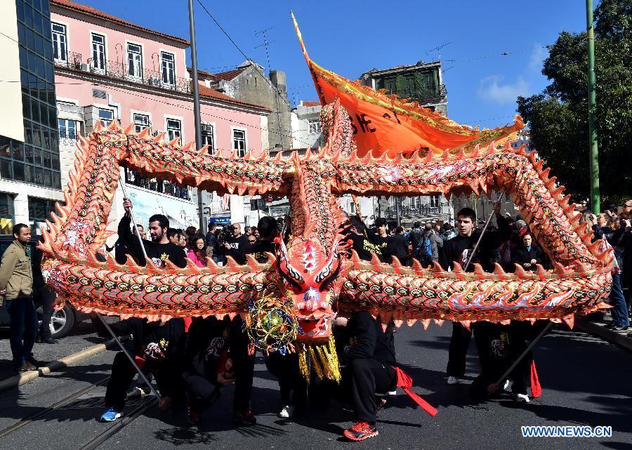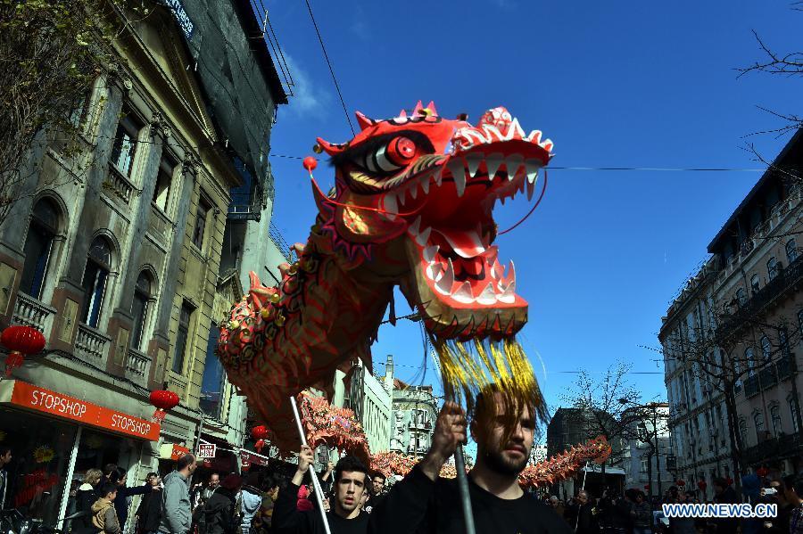 A Portuguese dragon dance team perform during a celebration of Chinese traditional Spring Festival in Lisbon, Portugal, Feb. 21, 2015. (Xinhua/Zhang Liyun)