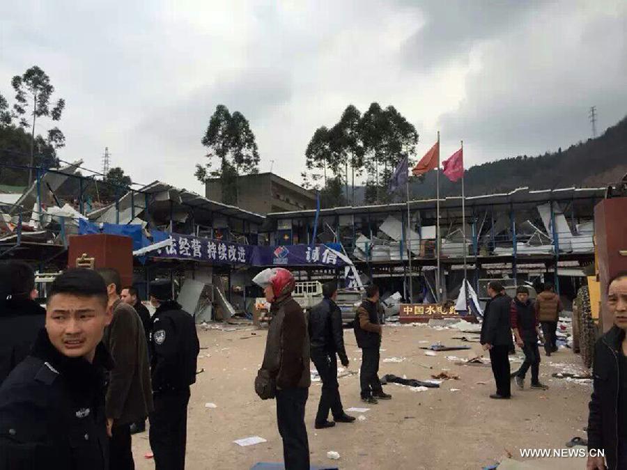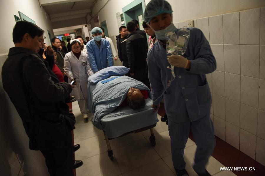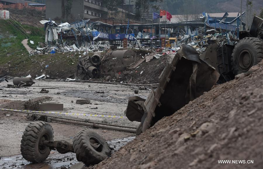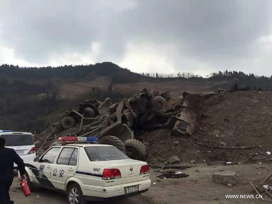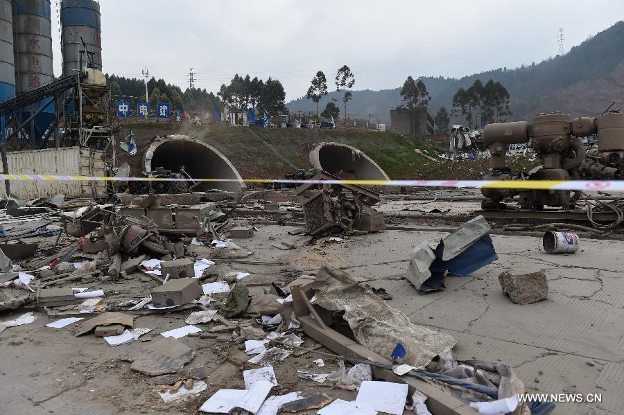 Photo taken on Feb. 24, 2015 shows the scene of a blast in a road tunnel under construction in Chengdu, capital of southwest China's Sichuan province. The blast might be caused by gas explosion on Tuesday in the No. 1 Tunnel of Wuluo Road. One person went missing, and 20 others were injured in the blast. (Photo/Xinhua)