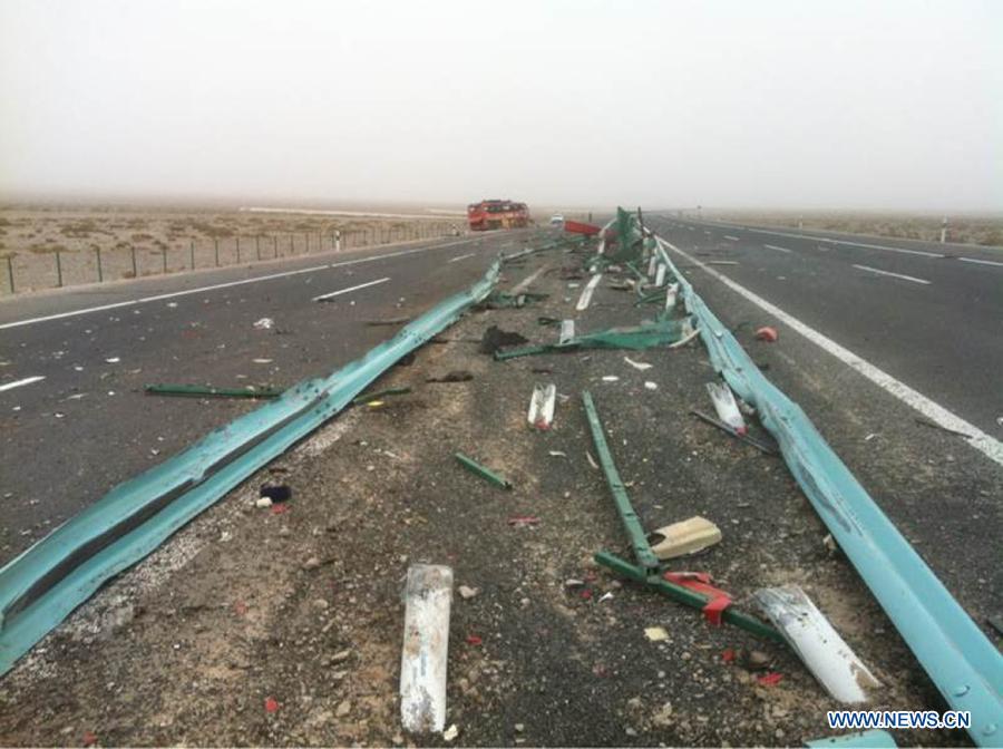 Photo taken on Feb. 25, 2015 shows the scene of a road accident site in Bachu County, Kashgar Prefecture, northwest China's Xinjiang Uygur Autonomous Region. A long-distance bus overturned on an expressway which links Kashgar with Aksu, late Tuesday night, killing 22 people and injuring 38 others. (Photo/Xinhua)