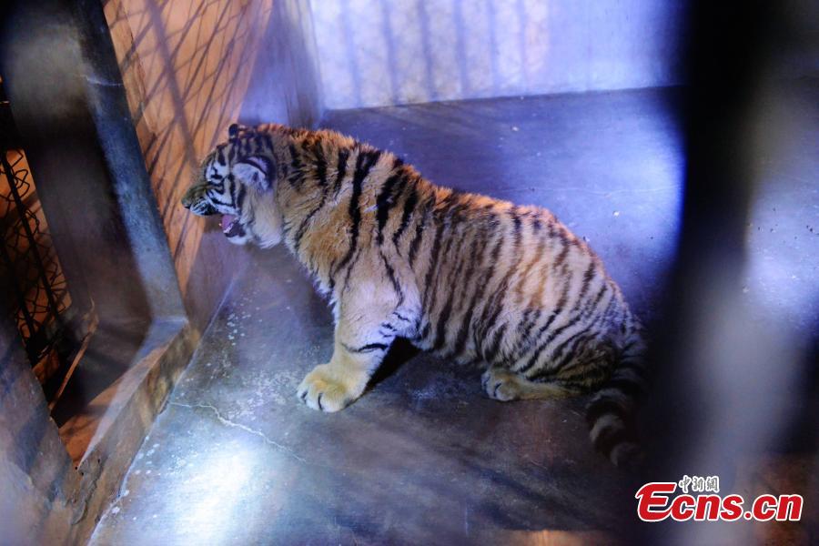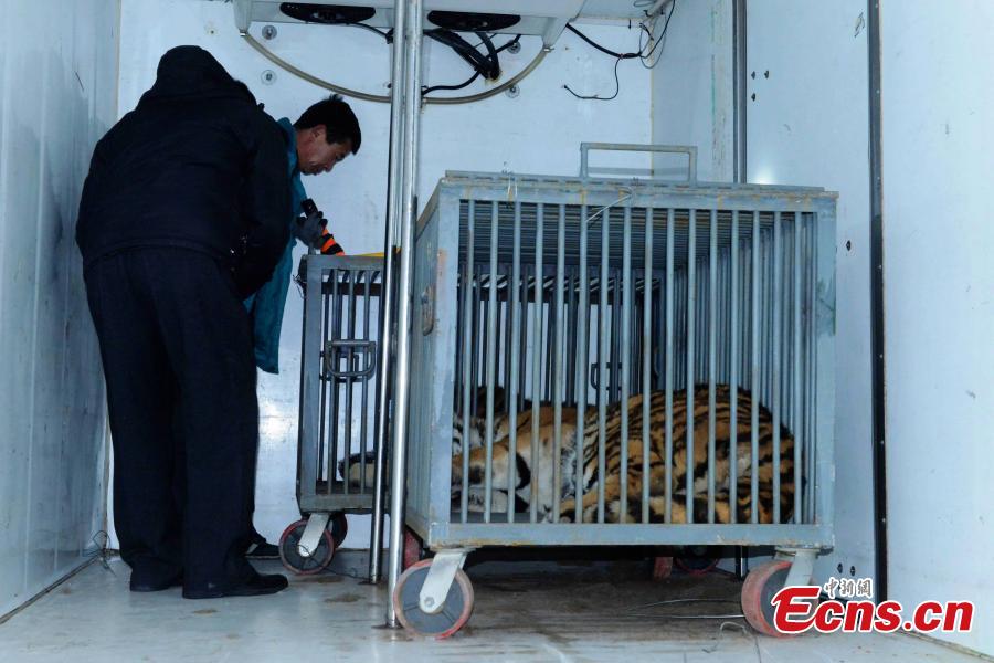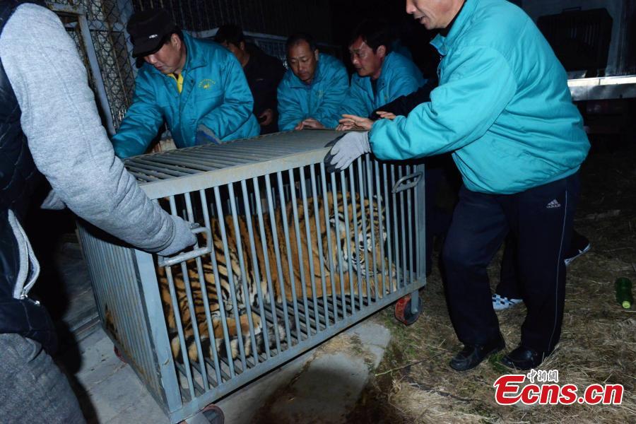 Two illegally-kept tigers are seen being transferred by workers to a wildlife conservation center in Qingdao, East China’s Shandong province on February 26, 2015. The two tigers were found being kept in a high-rise building in Pingdu city with another young tiger which jumped to its death on February 18, Lunar New Year’s Eve. The tiger was frightened by Spring Festival firecrackers and escaped from the cage. (Photo: China News Service/ Yu Fangping)