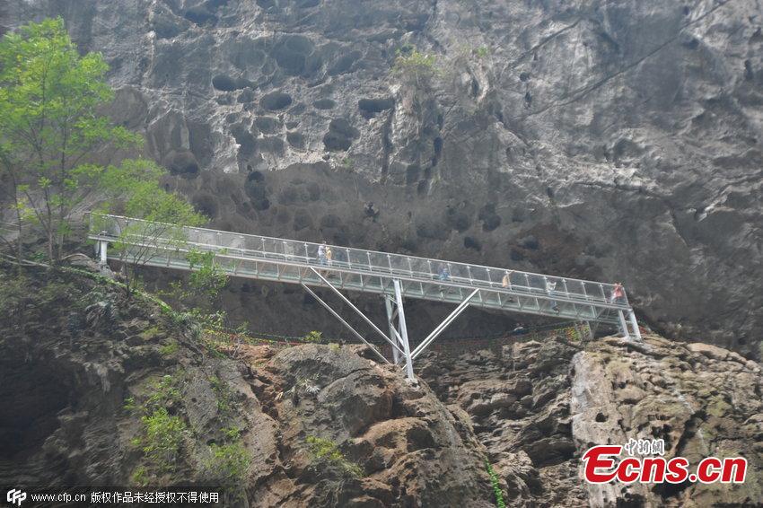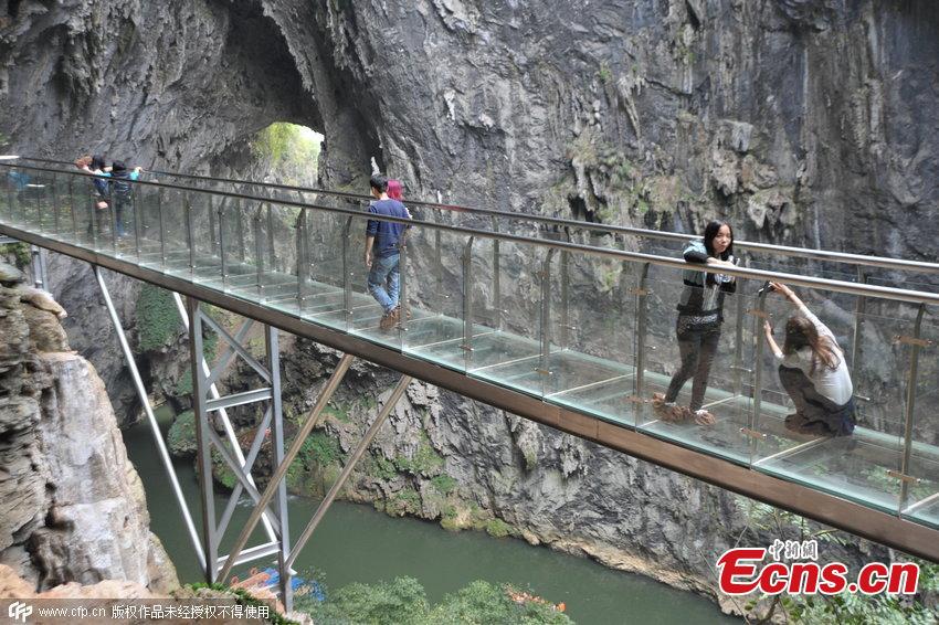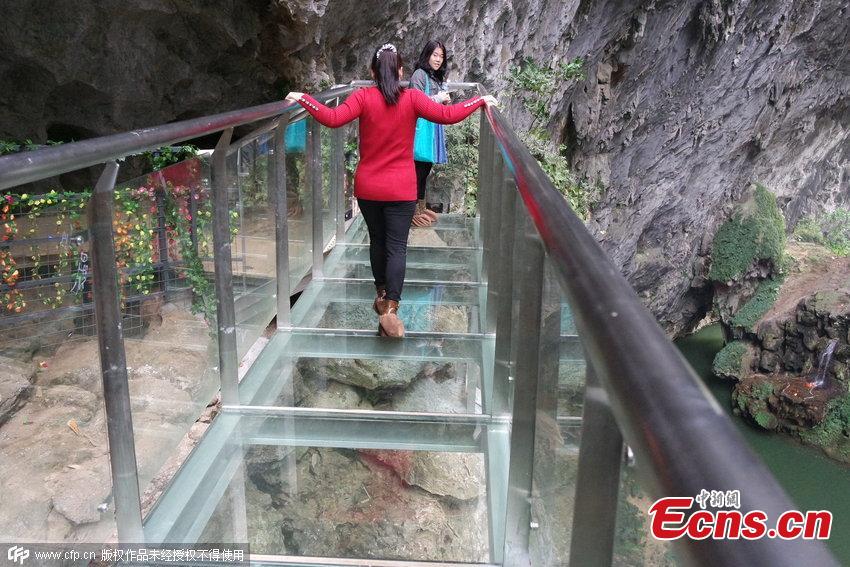Visitors walk on a suspended glass corridor, about 100 meters above the ground, in a karst cave, formed about 100 million years ago, in Jiulong town, South China's Guangdong province, Feb. 26, 2015. The town is a popular choice for self-guided driving tour. (Photo/CFP)