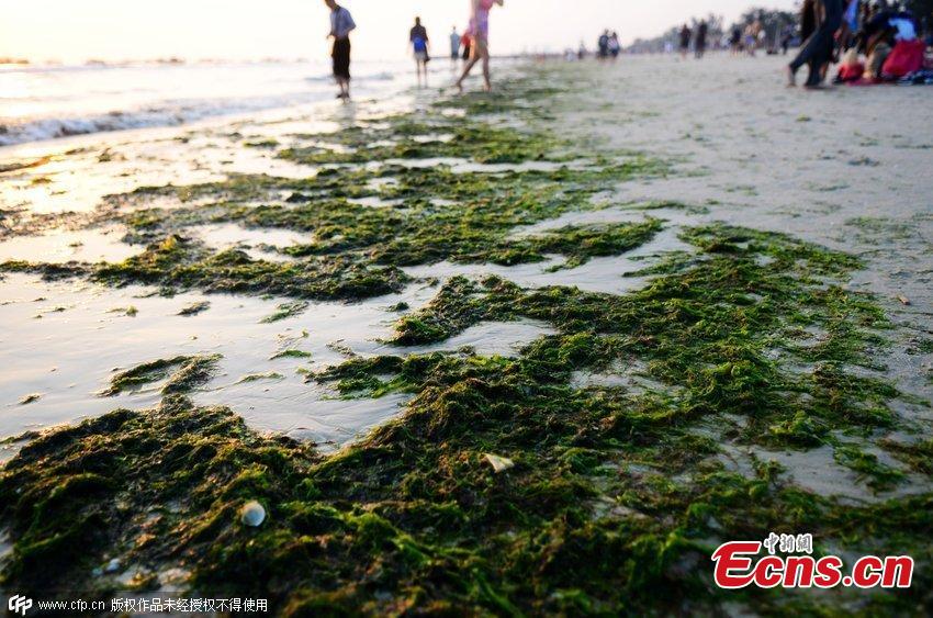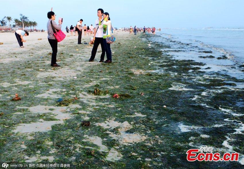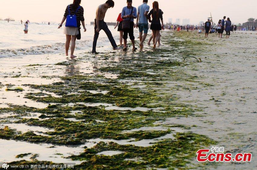 Tourists walk on a beach covered by algae in Beihai city, Southwest China’s Guangxi Zhuang autonomous region, Feb. 26, 2015. The algae has been invading Beihai’s coastal area in winter and spring for some years in a row. Experts attributed the invasion to land-based sources of pollution, such as wastewater discharged from factories. The clustered algae, while not harmful to health, is quite a nuisance to tourists. (Photo/CFP)