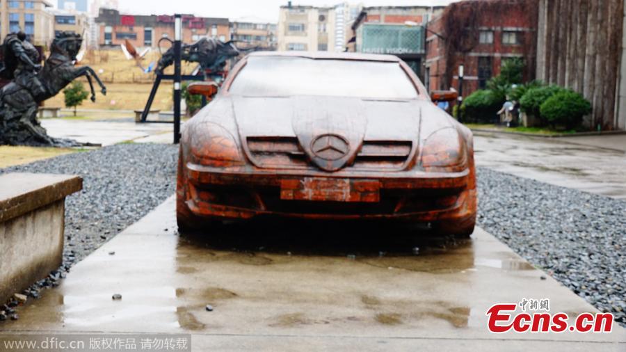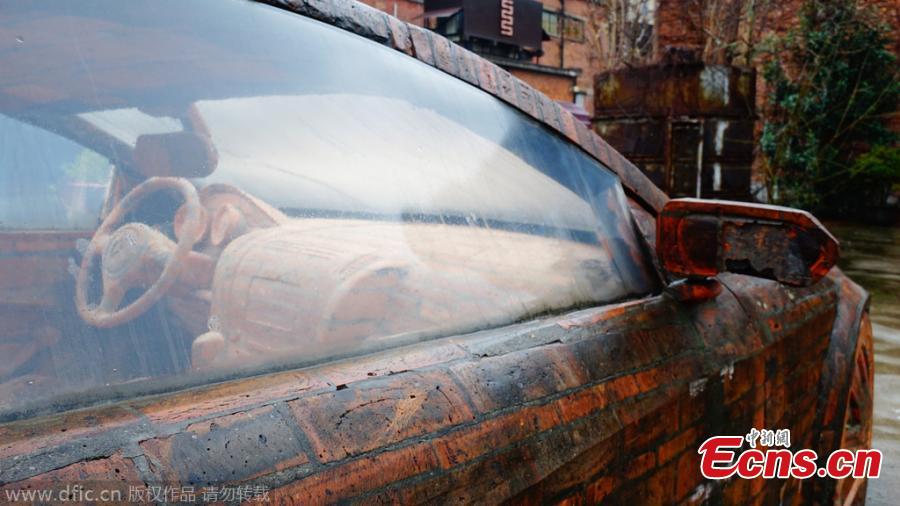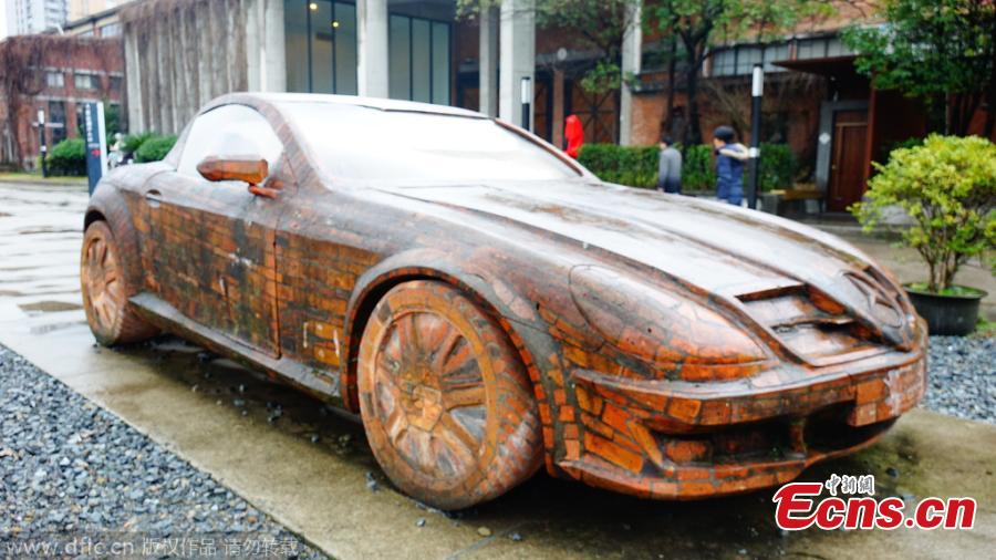 A Mercedes Benz sport car-like sculpture made of steel, cement and bricks is built on a street in Shanghai, Feb. 28, 2015. (Photo/IC)