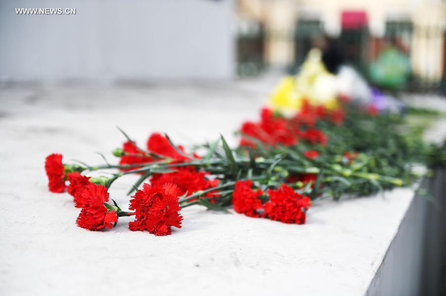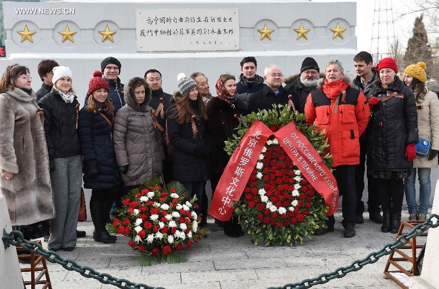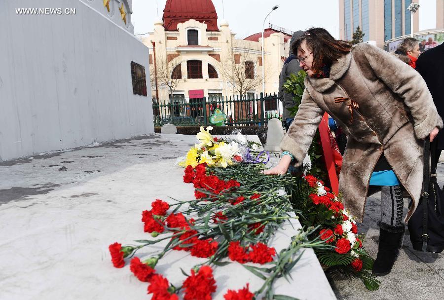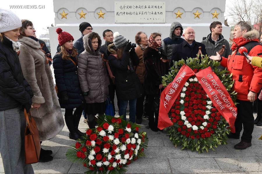 Representatives of Russians living in Harbin, capital of northeast China's Heilongjiang Province, present flowers to Soviet martyrs monument in Harbin, Feb. 28, 2015. Dozens of Russians living and working in Harbin attended a commemorative activity for Soviet Red Army soldiers who sacrificed during World War II on Saturday. The monument was set up in 1945 to commemorate Soviet soldiers who were killed in the fight against the Japanese invaders in China. (Xinhua/Wang Jianwei)