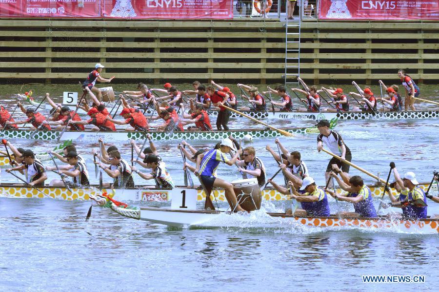 A dragon boat competes during an annual dragon boat race to celebrate the Chinese Lunar New Year in Sydney, Australia, on Feb. 28, 2015. (Xinhua/Jin Linpeng)