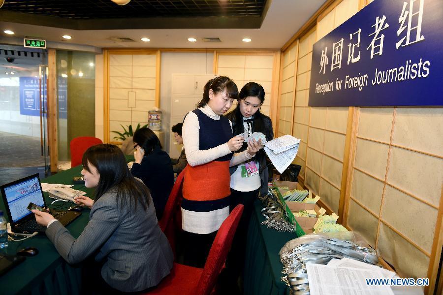 A Chinese employee (R) of Germany's ARD Fernsehen registers at the reception desk in Beijing, China, March 1, 2015. Foreign journalists reporting the third session of the 12th National People's Congress (NPC) and the third session of the 12th Chinese People's Political Consultative Conference (CPPCC) began to register on Sunday at the Media Center Hotel in Beijing. (Xinhua/Li Xin)