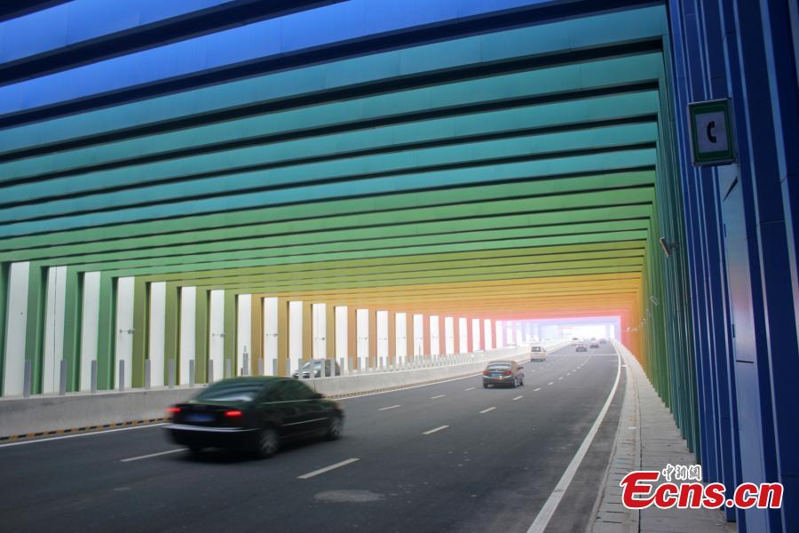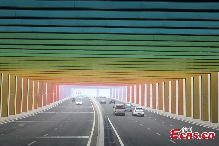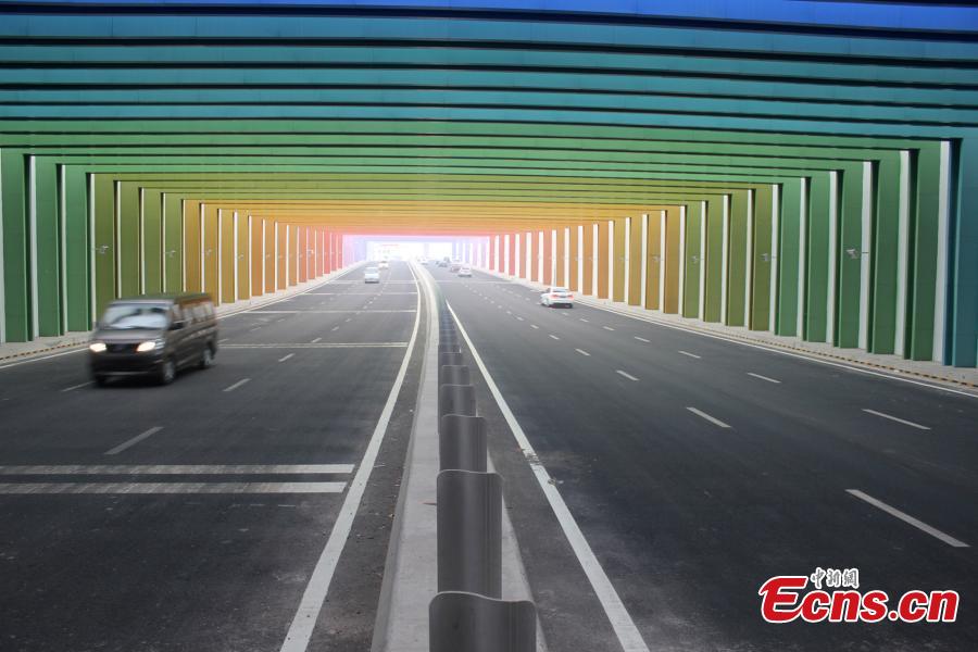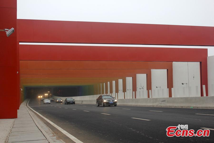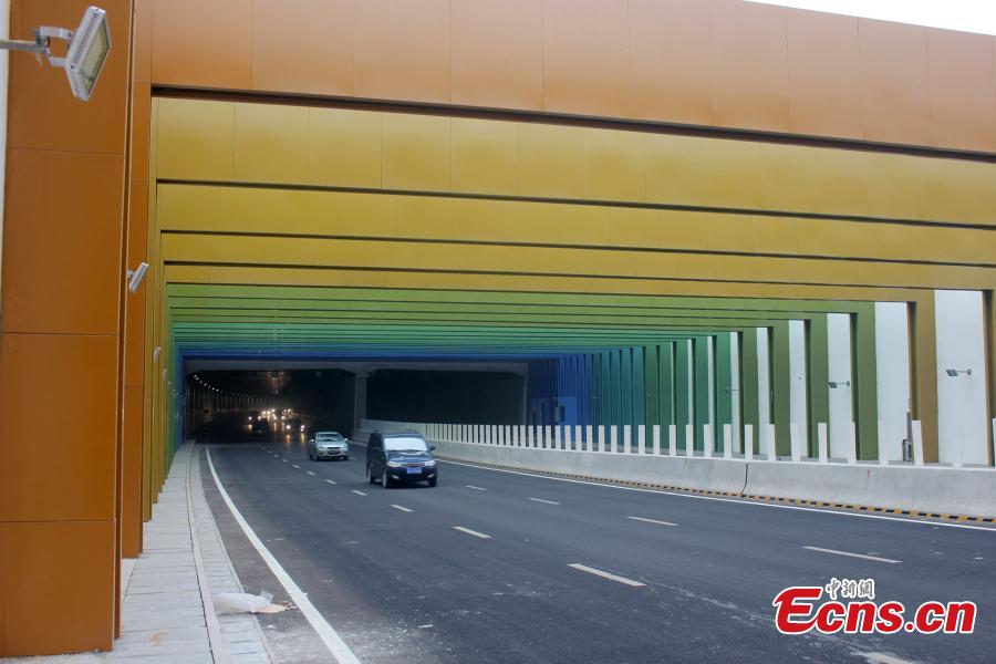 Vehicles run under a newly-built rainbow coloured tunnel in Zhengzhou, Central China’s Henan province. The 400-meter-long tunnel, the first of its kind in China, has a total investment of nearly 100 million yuan ($16 million), according to construction workers. From both ends to the middle section, the color transitions from purple to blue to help drivers get used to the light change as they enter and exit the tunnel, sources said. (Photo: China News Service/Ma Yiheng)