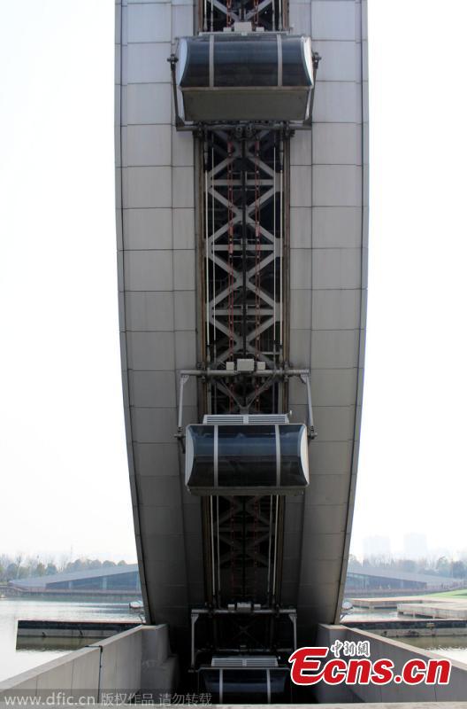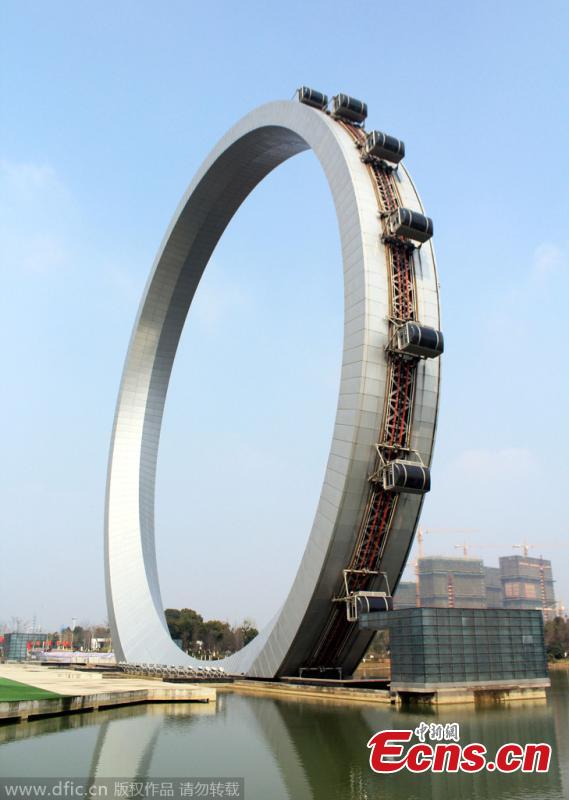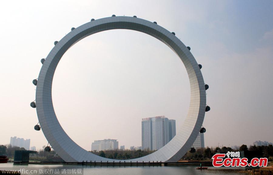 A Ferris wheel with no spokes and a diameter of 84 meter is seen in Changzhou, East China's Jiangsu province, Mar. 1, 2015. The project, at a cost of 150 million yuan ($24 million) and installed with 24 cabins, has not been put into operation after it was finished in 2013 because it fails to get approval from the General Administration of Quality Supervision, Inspection and Quarantine of the People's Republic of China. The ride looks like a ring compared to traditional Ferris wheels, and it is China's first one without spokes.(Photo/IC)