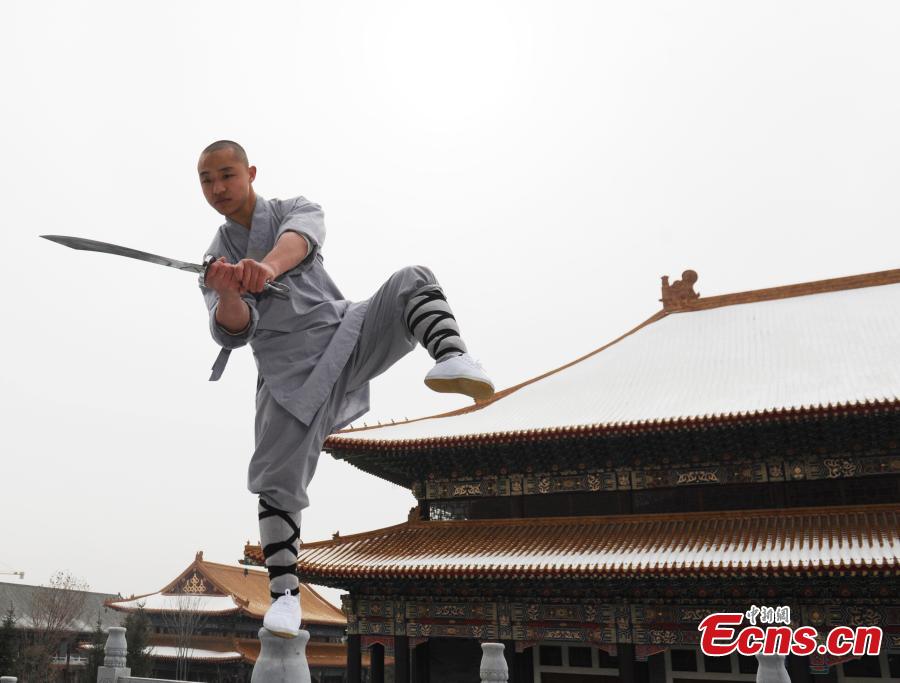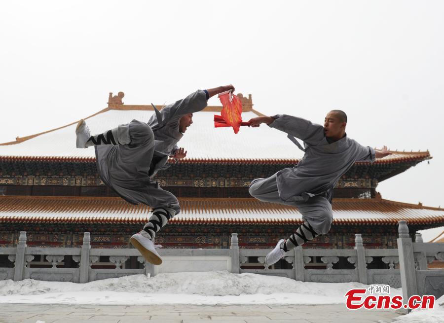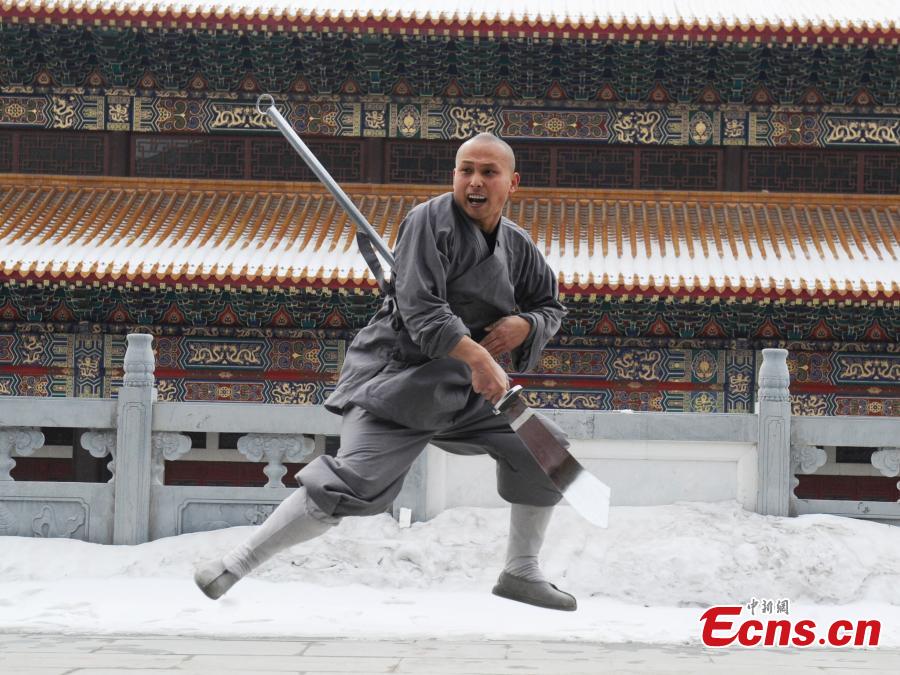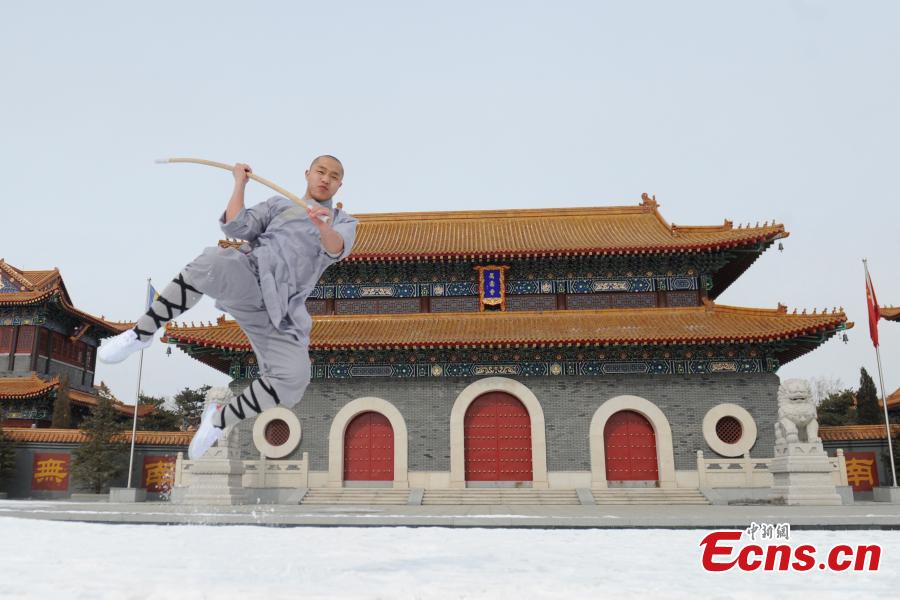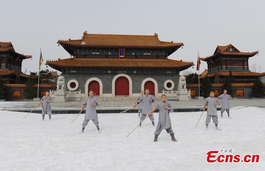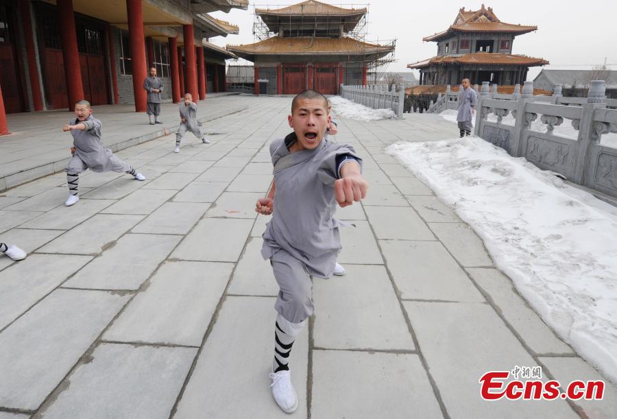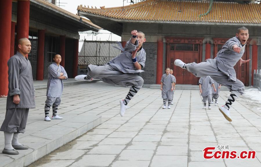 Monks practice kung fu at the Wanshou Temple (the temple of longevity) in Changchun, Northeast China’s Jilin province, Mar. 2, 2015. The temple has 12 monks who practice kung fu besides reciting mantra for six to seven hours a day, with the youngest at 11. (Photo: China News Service/Zhang Yao)