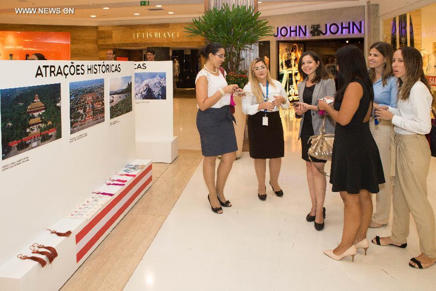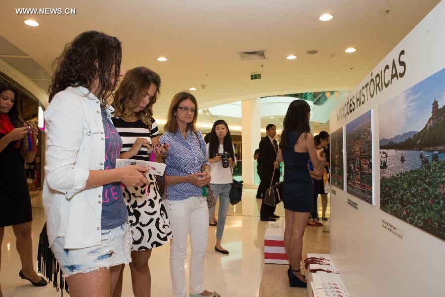 Visitors look at exhibited photos at a Beijing tourism photo show in Rio de Janeiro, Brazil, March 2, 2015. A photo exhibition featuring the scenery in Beijing kicked off here on Monday. Photos categorized in different themes such as "traditional culture" and "leisure life" were exhibited here, promoting the natural and cultural tourism of Beijing. (Photo: Xinhua/Xu Zijian)