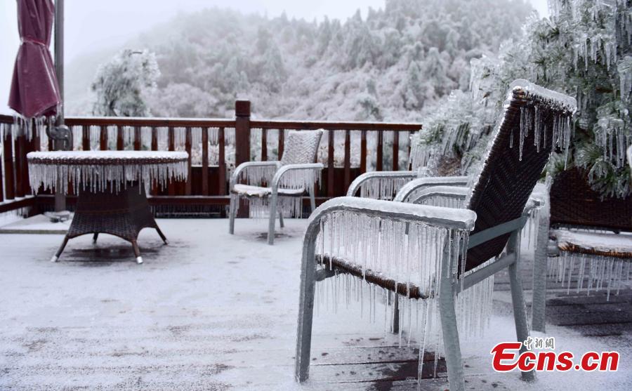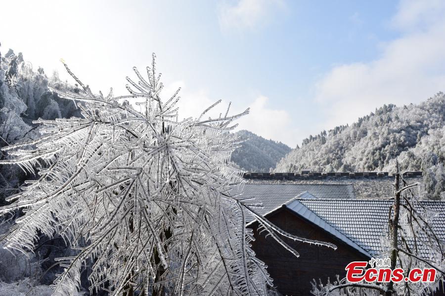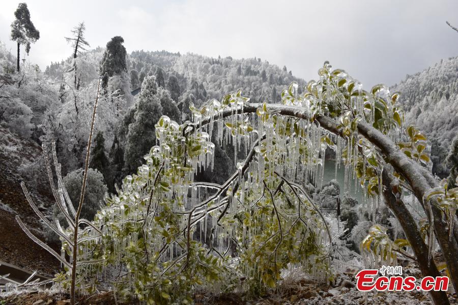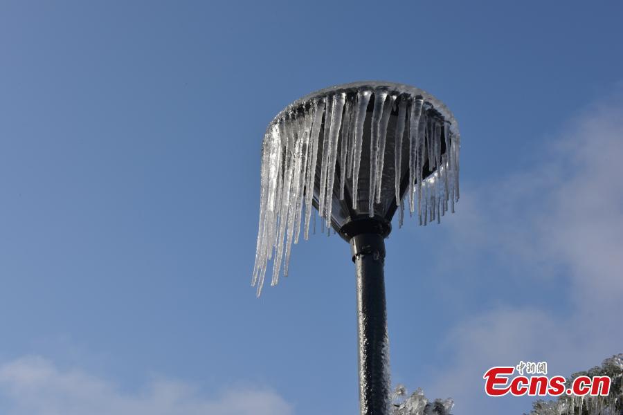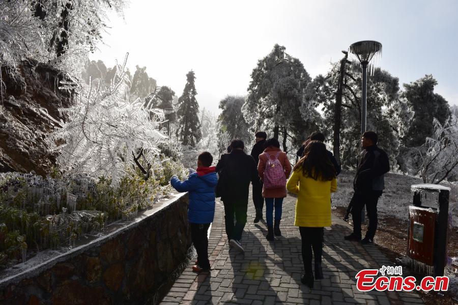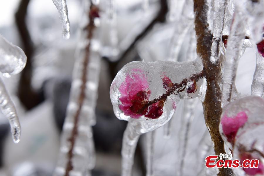Flowers and plants are among those frozen after a rain in cold weather at the Daming Mountain scenic spot in Lin'an city, East China's Zhejiang province, Mar. 1, 2015. Many tourists took photos of the spectacular landscapes at the scenic spot after the rain. (Photo: China News Service/Hu Jianhuan)