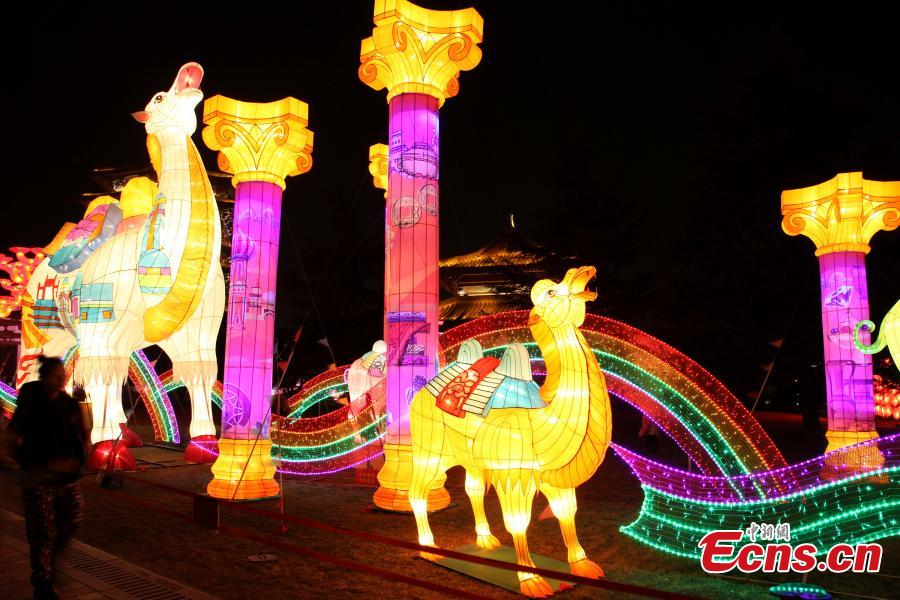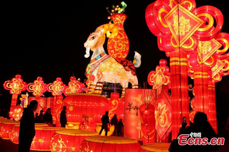 Visitors look at lanterns placed on the water and land for the upcoming Lantern Festival at the Tang Paradise in Xi'an, Northwest China’s Shaanxi province, Mar. 2, 2015. The show consists of a mixture of colorful lanterns featuring Chinese style and cartoon figures, attracting many tourists and residents to enjoy this joyous atmosphere. The Lantern Festival falls on the fifteenth day of its first lunar month, which is Mar. 5 this year. Tang Paradise, a large-scale royal garden presenting the styles and features during the Tang Dynasty (618-907), covers a total area of 1,000 mu (66.7 hectares), among which 300 mu is water, and is the largest theme park in the northwestern region of China. (Photo: China News Service/ Peng Hua)