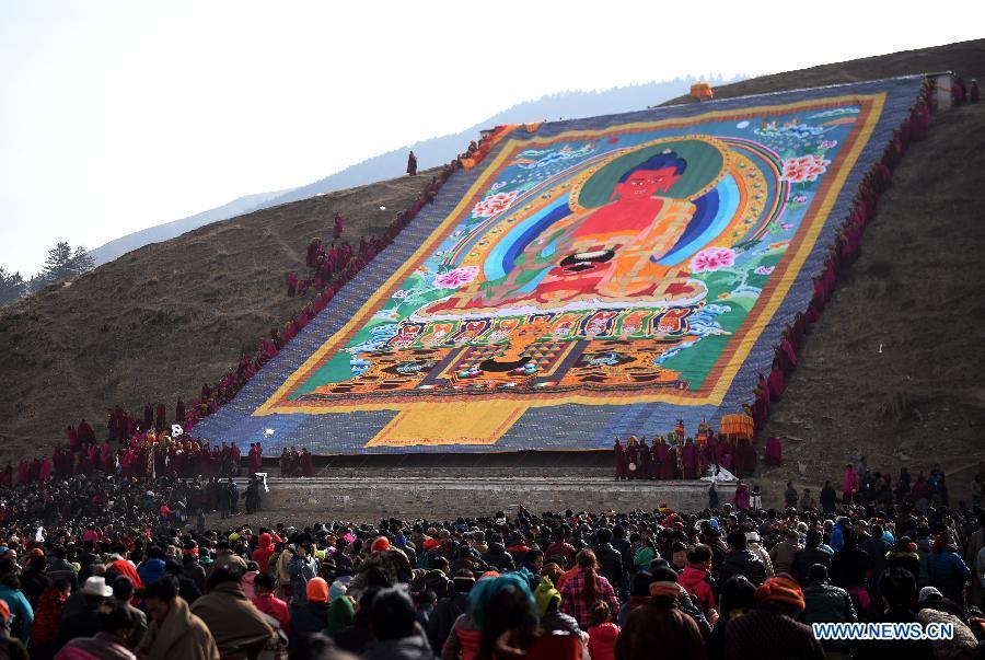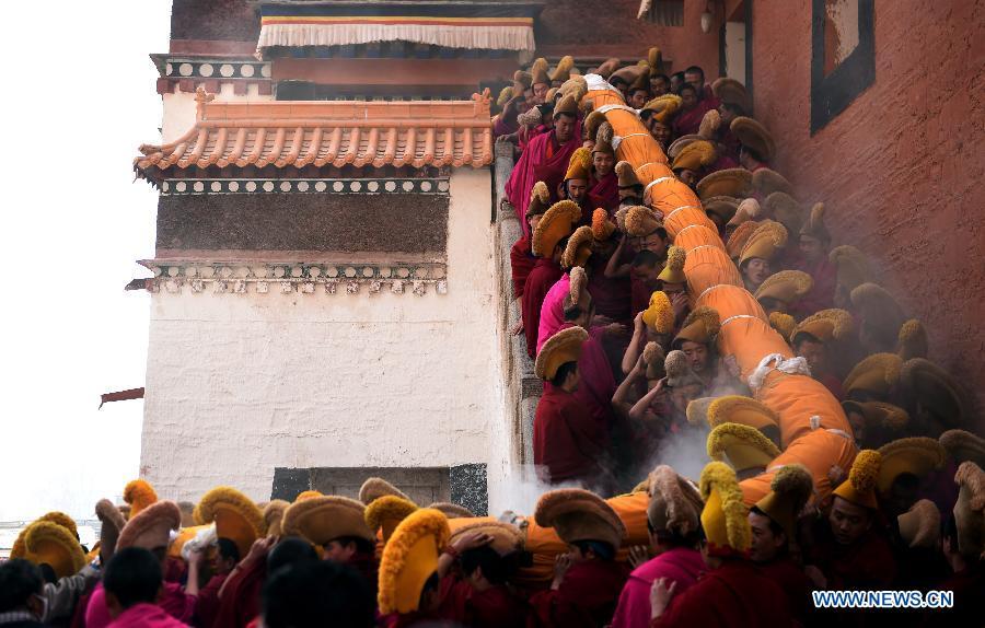 Lamas carry a gigantic Buddha tangka (Tibetan religious painting) to a hillside for an annual display ritual at the Labrang Monastery in Xiahe County, northwest China's Gansu province, March 3, 2015. The Buddha tangka display, or "the basking of Buddha", is a Tibetan Buddhism traditional praying for a good year. (Photo: Xinhua/Fan Peishen)