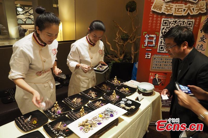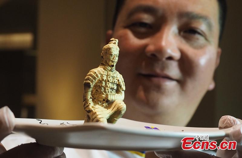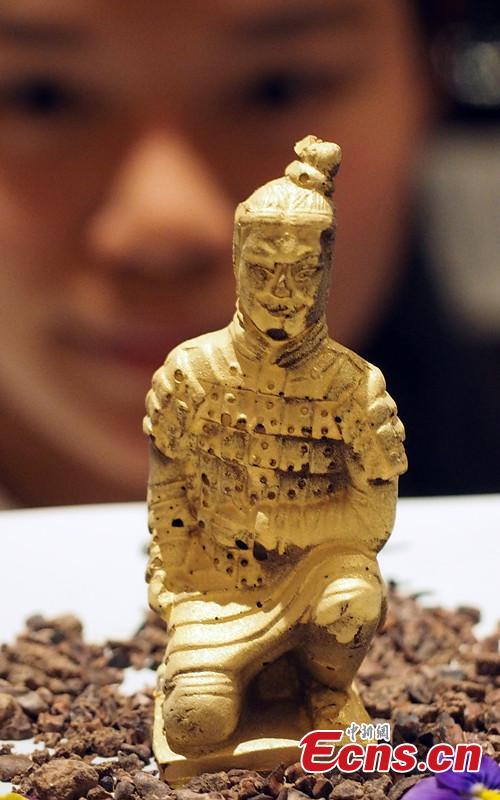 A Terracotta Warrior made of chocolate by Chinese cooking master Yang Yong is on display during an activity to mark the second anniversary of the founding of Sichuan Province Chamber of Commerce in the United States in Los Angeles, Mar. 2, 2015. (Photo: China News Service/Mao Jianjun)