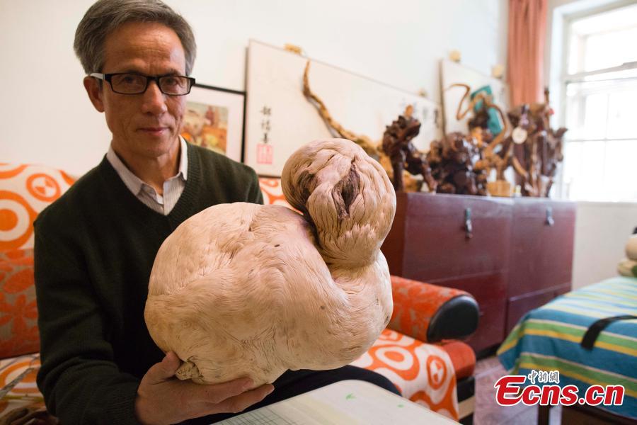 Gao Fushan, wood carver, takes care of his work “Reposing Goat” in Taiyuan, North China’s Shanxi province, Mar. 3, 2015. Gao made the piece with the root of a pine tree in Mount Wutai, a Buddhist mountain inscribed on UNESCO's World Heritage list. (Photo:China News Service/Zhang Yun)