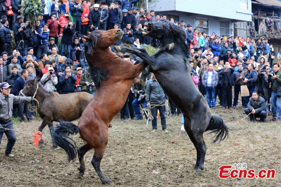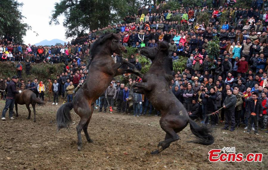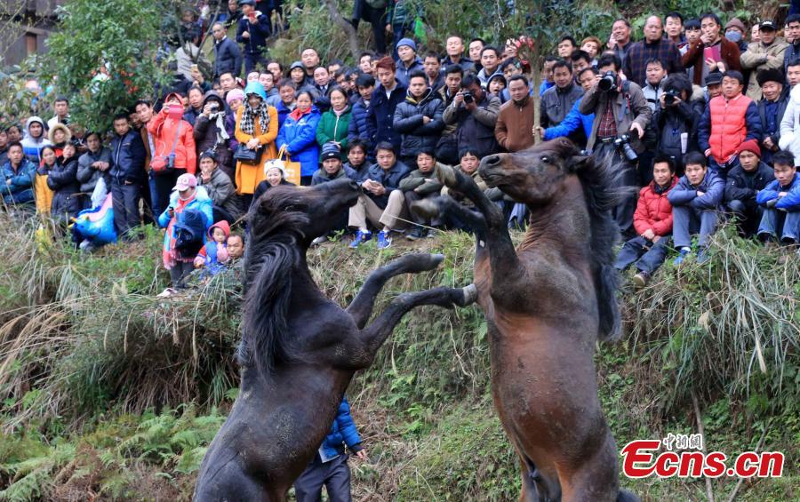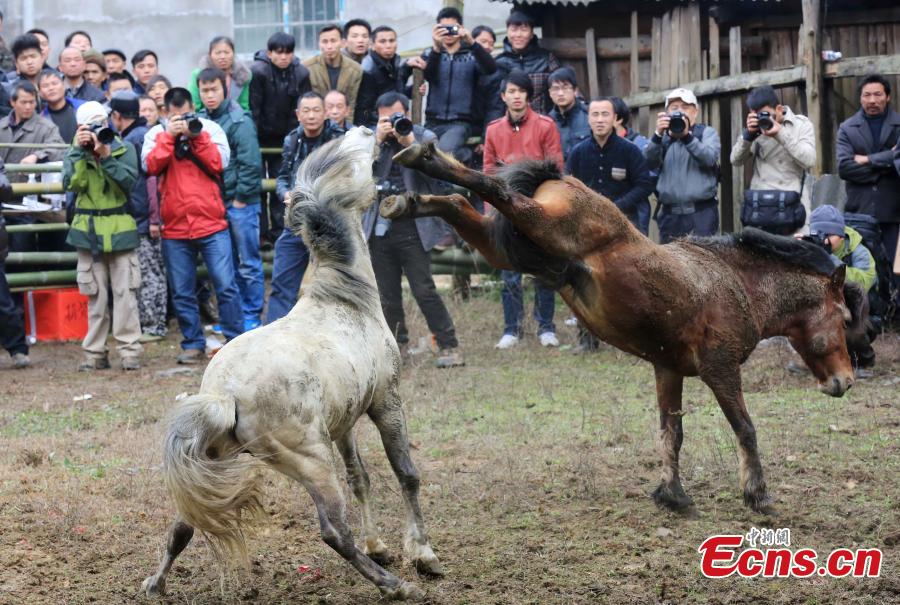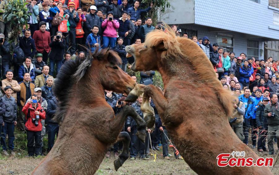 People watch horses fight during a traditional local event held by the Miao ethnic minority in Rongshui county, Southwest China’s Guangxi Zhuang autonomous region, March 3, 2015. The event, with a history of more than 500 years, is organized to celebrate the Lantern Festival, on the 15th day of the first lunar month, which is March 5 this year. (Photo: China News Service/Tan Kaixing)