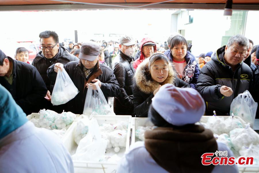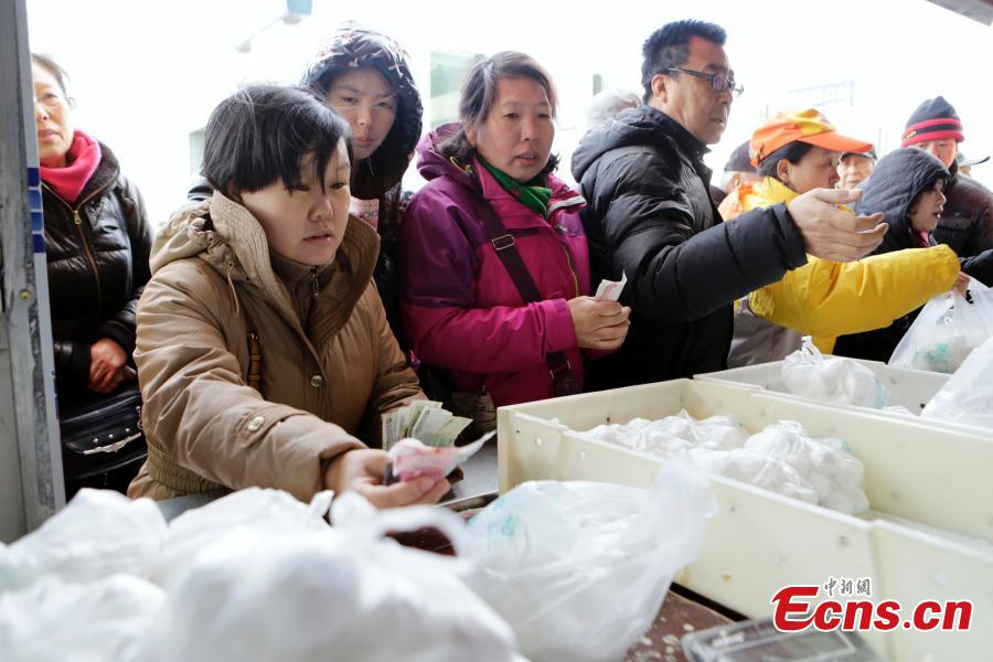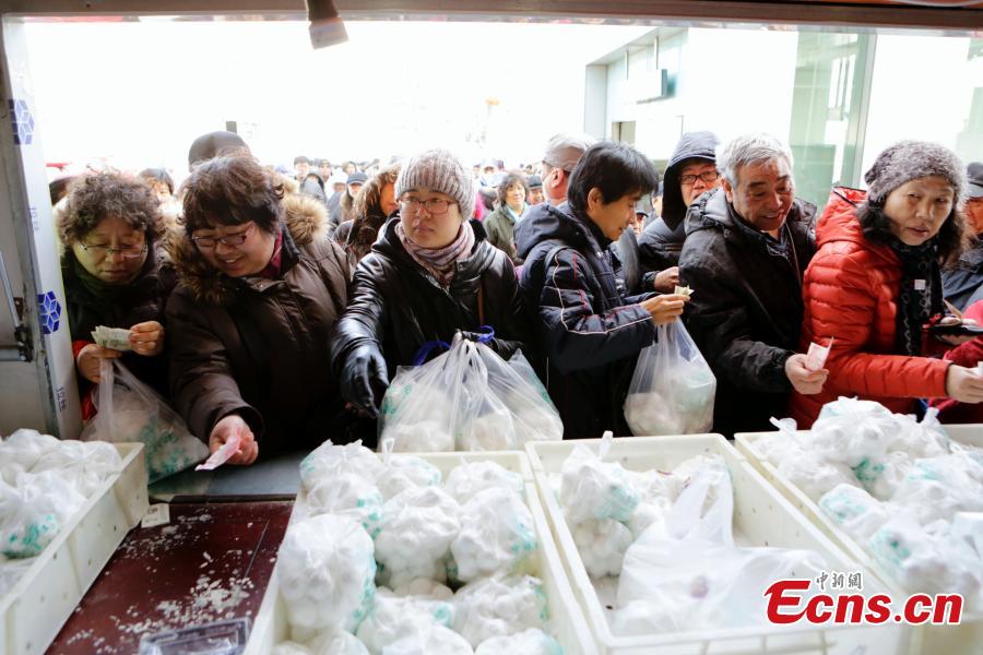 People stand in a long queue to purchase glutinous rice balls to celebrate the upcoming Lantern Festival in Beijing, March 4, 2015. As the festival falls on March 5, the 15th day in the first lunar month, demand for glutinous rice balls, especially Beijing’s time-honored brand, increases rapidly while cooks are busy packing their supplies. (Photo: China News Service/ Li Huisi)