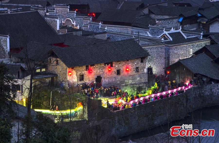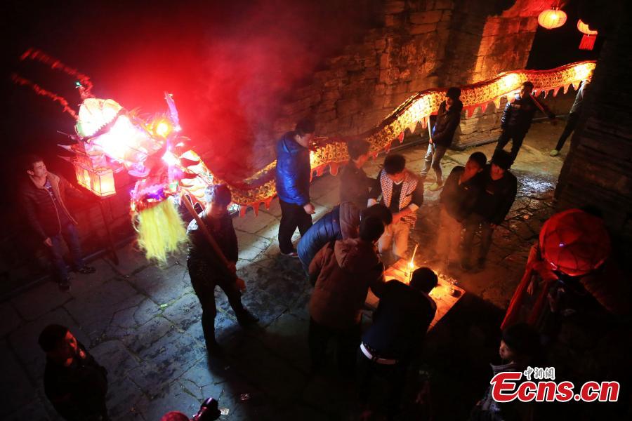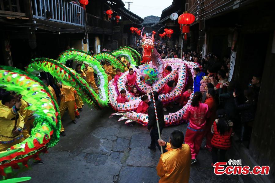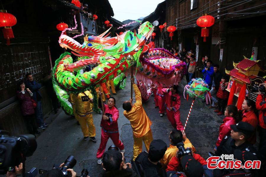 A dragon dance is performed while gongs and drums are played to celebrate the upcoming Lantern Festival at Zhaiying ancient town in Songtao Miao autonomous county, Southwest China’s Guizhou province, March 3, 2015. The dragon dance tradition has a history of more than 600 years in the town. (Photo/China News Service)