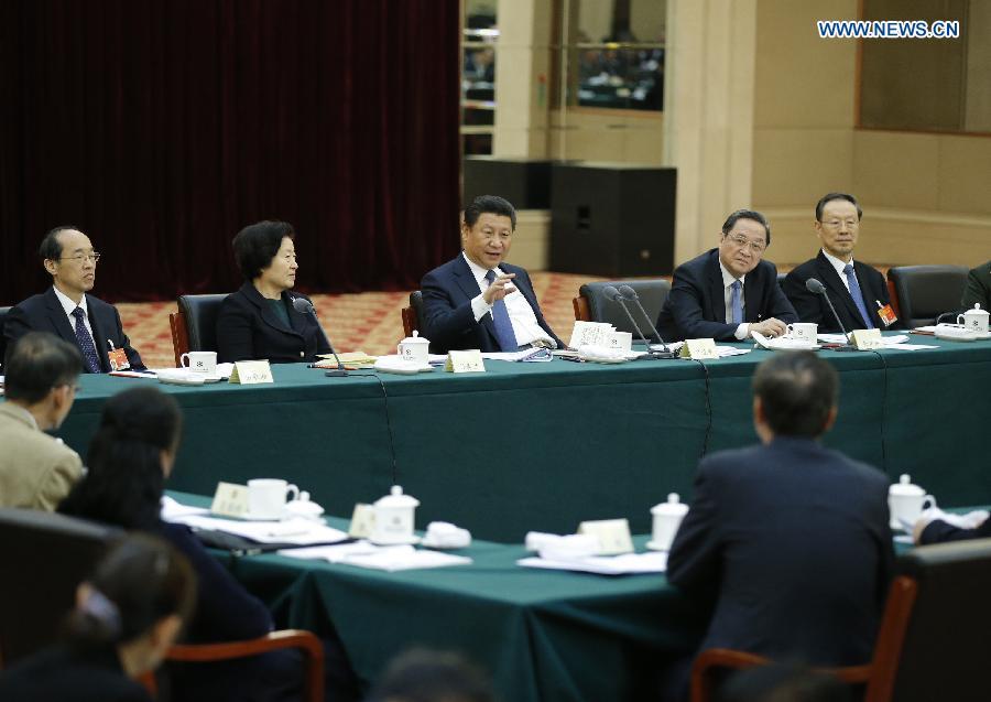 Chinese President Xi Jinping (front R), also general secretary of the Communist Party of China (CPC) Central Committee and chairman of the Central Military Commission, visits members of the 12th National Committee of the Chinese People's Political Consultative Conference (CPPCC) and joins their panel discussion in Beijing, capital of China, March 4, 2015. Yu Zhengsheng, chairman of the National Committee of the CPPCC and a member of the Standing Committee of the Political Bureau of the CPC Central Committee, also attended the event. (Photo: Xinhua/Ju Peng)